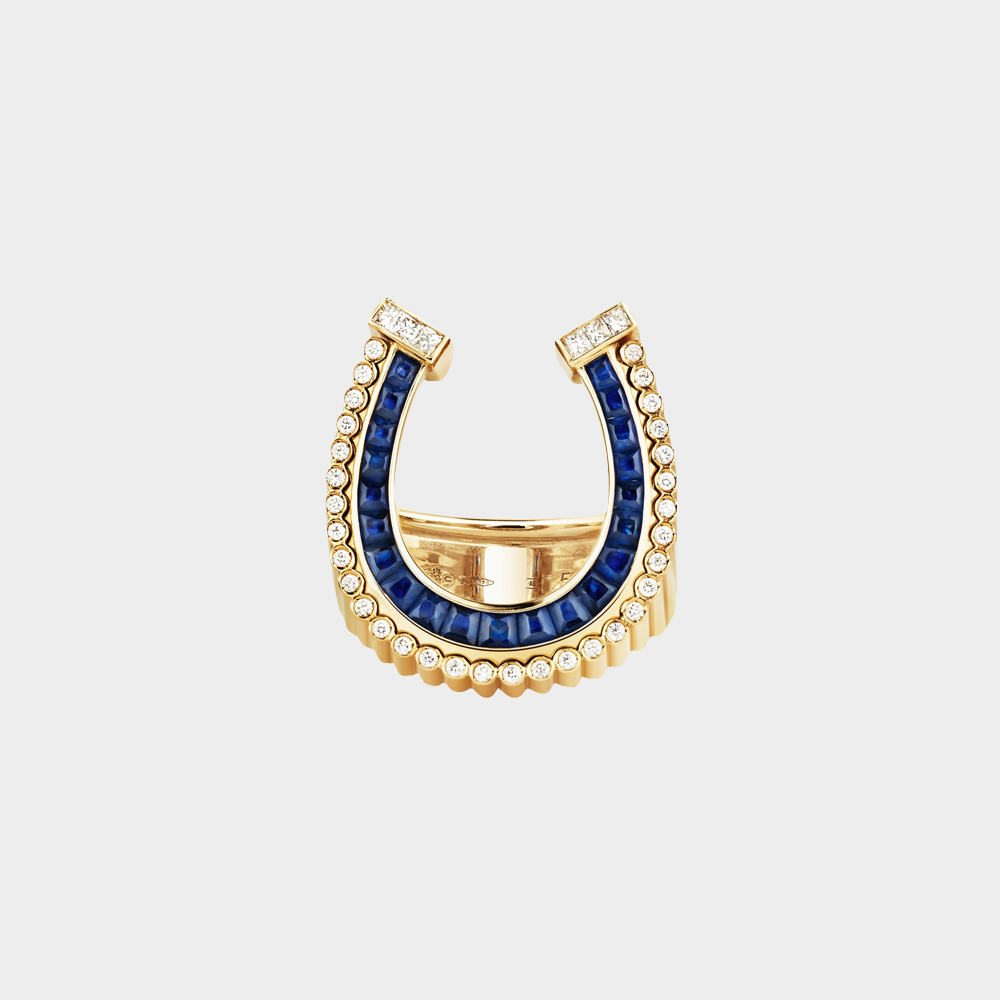 Anel Horseshoe em ouro amarelo com diamantes e safiras azuis, € 14,800, Marie Lichtenberg.