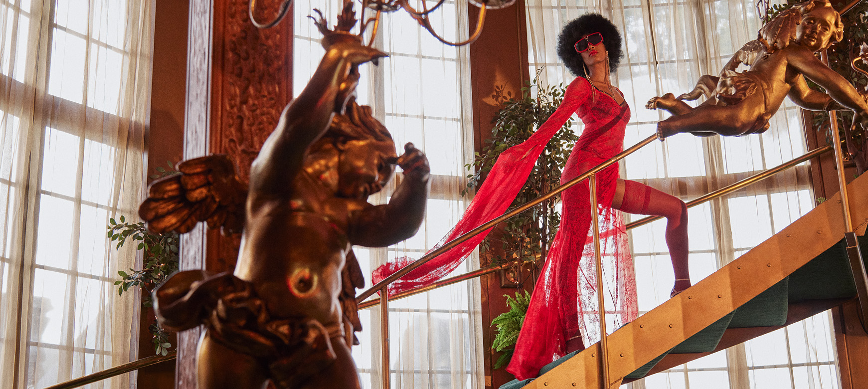 Eva: vestido, soutien, meias, carteira e sapatos, tudo DOLCE & GABBANA. Colar, ERICKSON BEAMON. Avery: top e saia, AREA. Collants, CALDEO. Botas, JIMMY CHOO. Brincos, ERICKSON BEAMON. Mi’Jon: casaco e cuecas de biquíni, AREA. Collants, CALZEDONIA. Mules, JIMMY CHOO. Soutien e cuecas no candeeiro, INTIMISSIMI.
