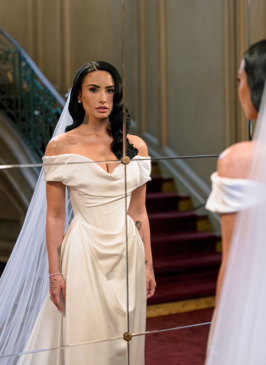 “Quando estava a pensar [no estilo de vestido que queria], dei por mim a voltar muitas vezes aos modelos de Vivienne – especificamente à forma como as silhuetas complementam realmente as curvas do corpo e ao uso de espartilhos”, acrescentou. Ao lado da sua stylist Jill Jacobs, Demi finalizou o look com um véu no estilo catedral com uma só camada, de comprimento personalizado e feito de tule marfim.