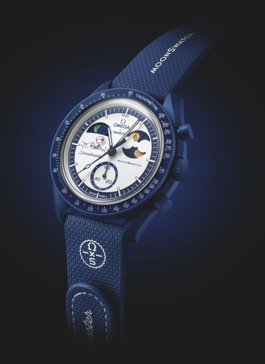 O mostrador inclui ainda duas luas revestidas a Moonshine Gold da Omega, assim como um detalhe encantador: Snoopy, o beagle mais famoso da aviação, que repousa ao lado do seu companheiro Woodstock, maravilhados com o espetáculo da Terra suspensa no espaço. Sob luz ultravioleta é possível também ler uma frase secreta, em homenagem ao espírito pioneiro que levou o Moonwatch original ao espaço.