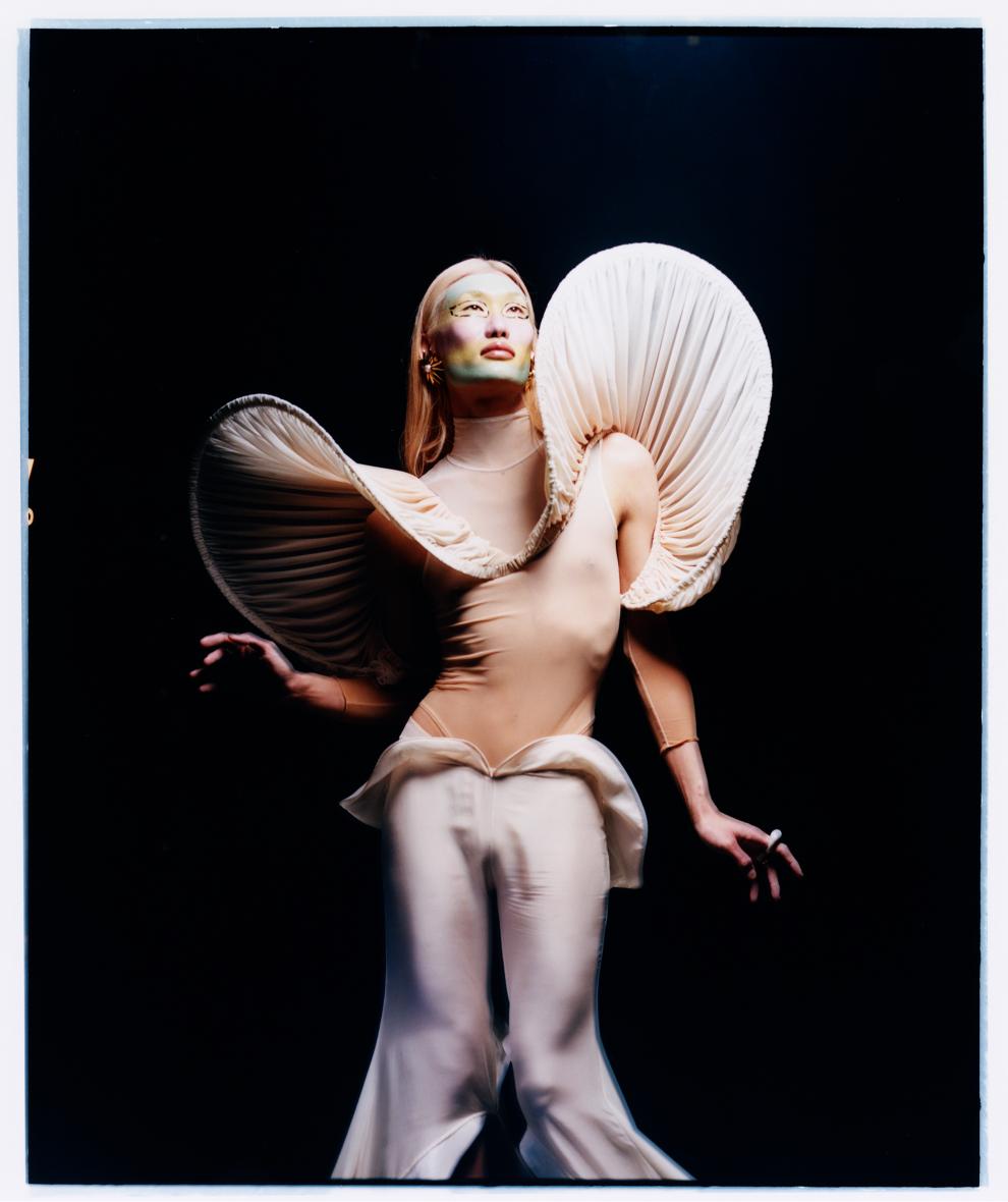 Ayò: vestido e luvas, SIMONE ROCHA. Headpiece e polainas, PARISER. Sapatos, TOGA.