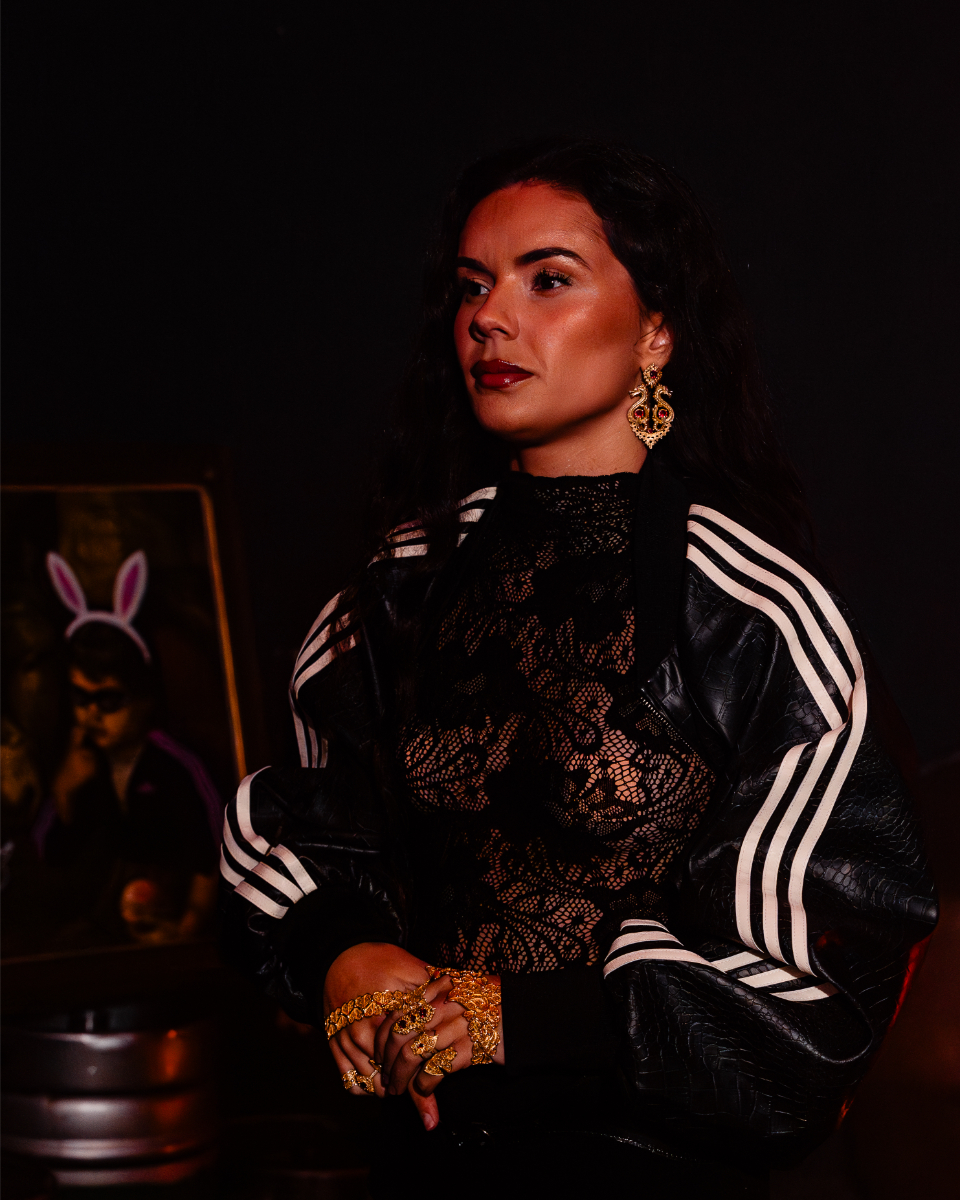 Existem dois elementos que mantêm sempre essa continuidade visual: o cabelo e as joias. O cabelo quase sempre solto, muito natural, com um volume forte, que comunica uma energia visceral e instintiva. As joias também são uma parte essencial dessa identidade. São joias tradicionalmente associadas ao fado, mas inventei uma forma personalizada de as usar. Uso aneis em todos os dedos, muitas pulseiras, colares e brincos grandes. As pulseiras são usadas como se fossem luvas, criando uma espécie de armadura simbólica. (...) No fundo, a imagem é aquilo que comunica quando não há espaço para explicações. É ela que revela a intenção, o conceito e a energia de tudo o que está a acontecer. Por isso, no meu caso, a imagem nunca é um detalhe. Tudo é pensado milimetricamente.