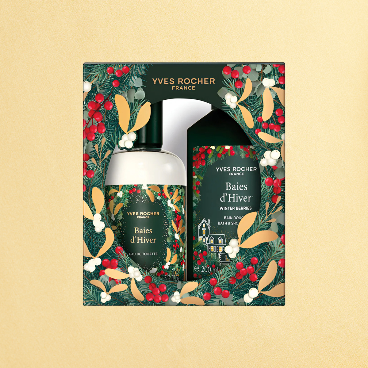 Inspirado pelo charme da aldeia natal da Yves Rocher, em La Gacilly, o kit com o aroma Bagas de Inverno traduz o espírito acolhedor do Natal em fragrâncias e rituais de cuidado. O duo perfumado combina a doçura envolvente da baunilha com o frescor floral das bagas rosa, criando uma atmosfera quente e reconfortante, perfeita para os dias mais frios. Composta por um eau de toilette e um gel de banho, esta edição é um presente capaz de transformar a rotina de beleza num gesto festivo e sensorial.