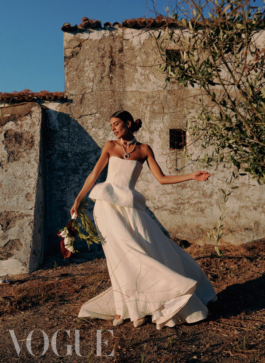 Para criar o seu vestido de sonho, foi no designer português Nuno Abrantes que a atriz confiou. Como conta Isabela Valadeiro à Vogue, este foi um processo desenvolvido em conjunto que teve como inspiração as grandes casas de Moda italianas e francesas como Schiaparelli e Dior. Optando pelo dramatismo na silhueta e pela simplicidade nos detalhes, a atriz usou um modelo em branco-pérola que foi pensado para fluir com o ambiente da cerimónia e com a natureza envolvente.