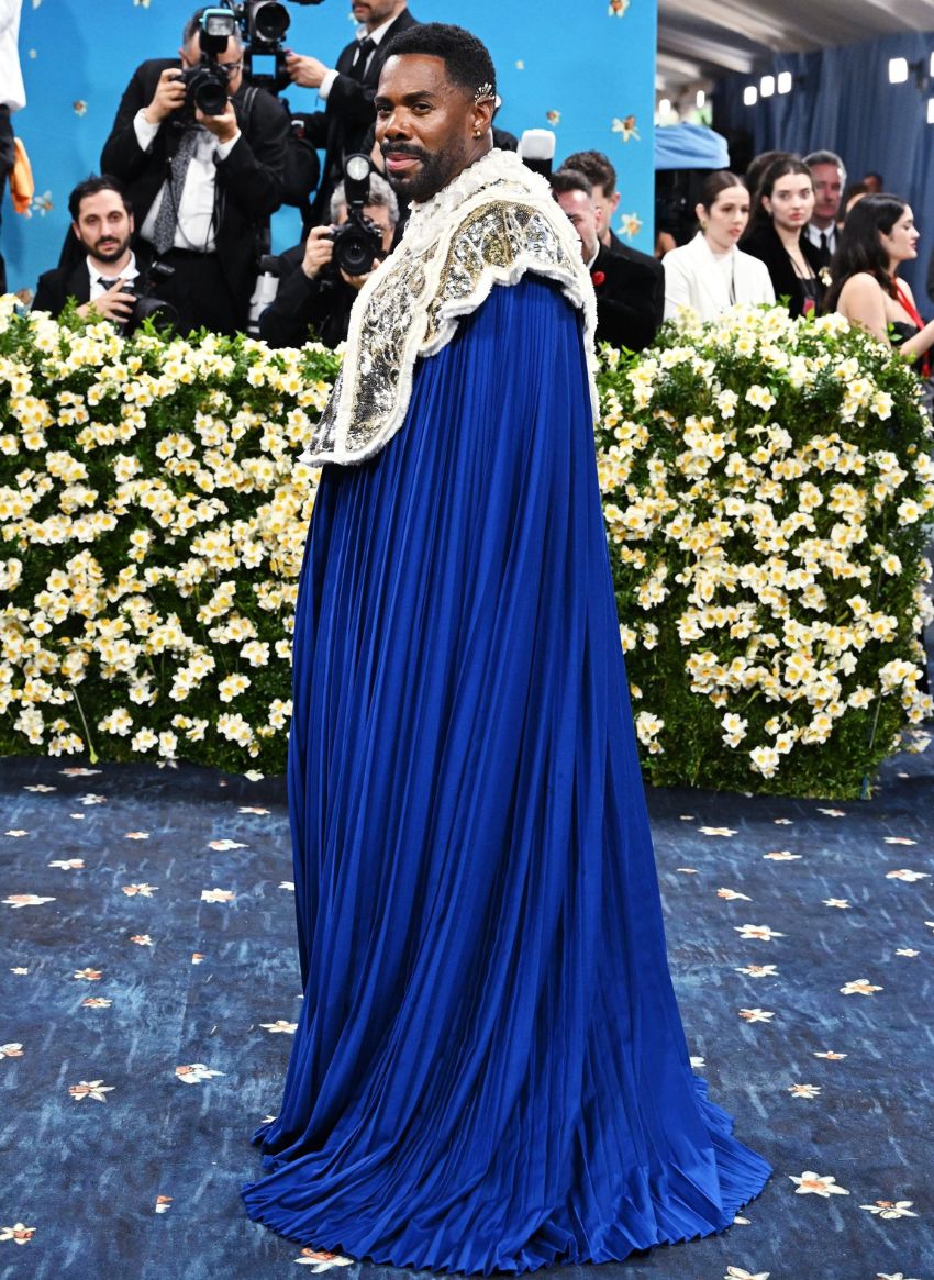 Colman Domingo na Met Gala 2025 presta homenagem ao dandy da Moda André Leon Talley num look Valentino com uma capa azul.