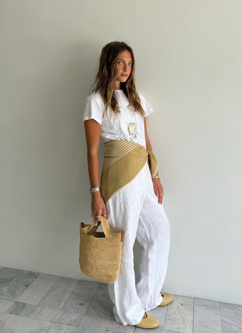 Para quem gosta de fatos de linho, a combinação para experimentar nesta estação é a clássica combinação de calças de linho fluidas e t-shirt branca — simples, elegante e leve, a tela em branco perfeita para conjugar com acessórios como um lenço (neste caso, em tons neutros). Combine com um par de sabrinas butter yellow e uma carteira de palha.