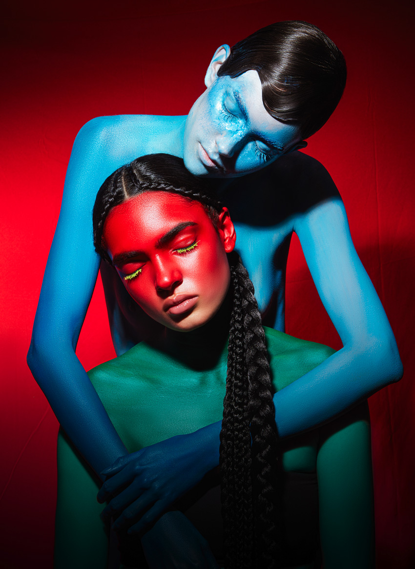 Kisha: vestido, MARINA HOERMANSEDER. Brincos e colar, SCHIAPARELLI. Pigmento em creme Colorfix nos tons Primary Red e Primary Yellow, € 25,50, DANESSA MYRICKS BEAUTY. Pigmento metalizado em creme no tom verde, € 7,35, DIAMOND FX.