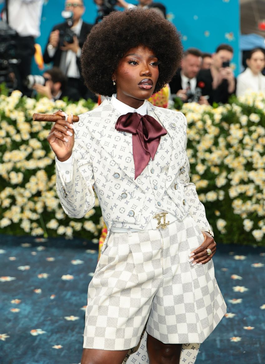 De facto, para a sua primeira Met Gala, Doechii recorreu à maison francesa. Vestida com um fato curto Louis Vuitton, assinado por Pharrell, com um casaco de smoking com o monograma da marca e calções com a assinatura damier, encarnou verdadeiramente o espírito da noite. O acessório era um laço cor de vinho que combinava com as meias até ao joelho e os sapatos com fivela, e levava uma mala Speedy mini. Na outra mão? Um charuto.