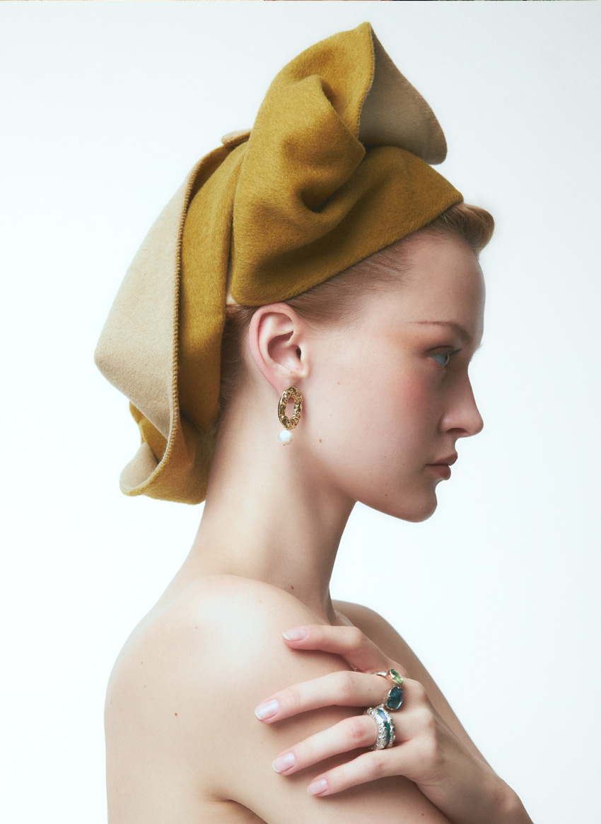 Top (usado na cabeça), TOVE. Brincos e anel, ALCINO SILVERSMITH. Anel, INVITRO.