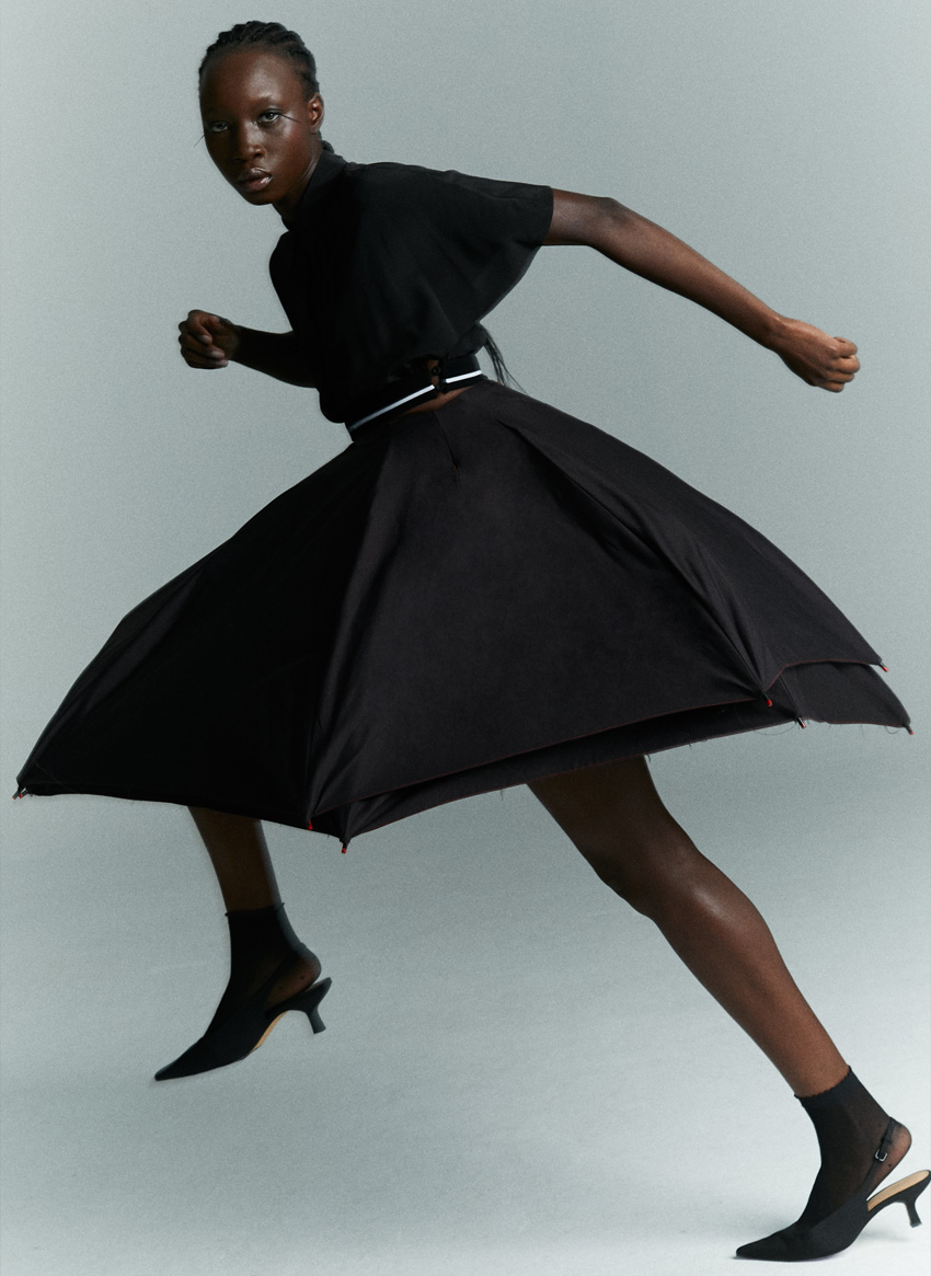 Top, MIU MIU. Saia, MARVIN BEEKMAN. Meias, FALKE. Sapatos, OTHER STORIES; casaco e top, MARVIN BEEKMAN. Meias, FALKE. Sapatos, OTHER STORIES.