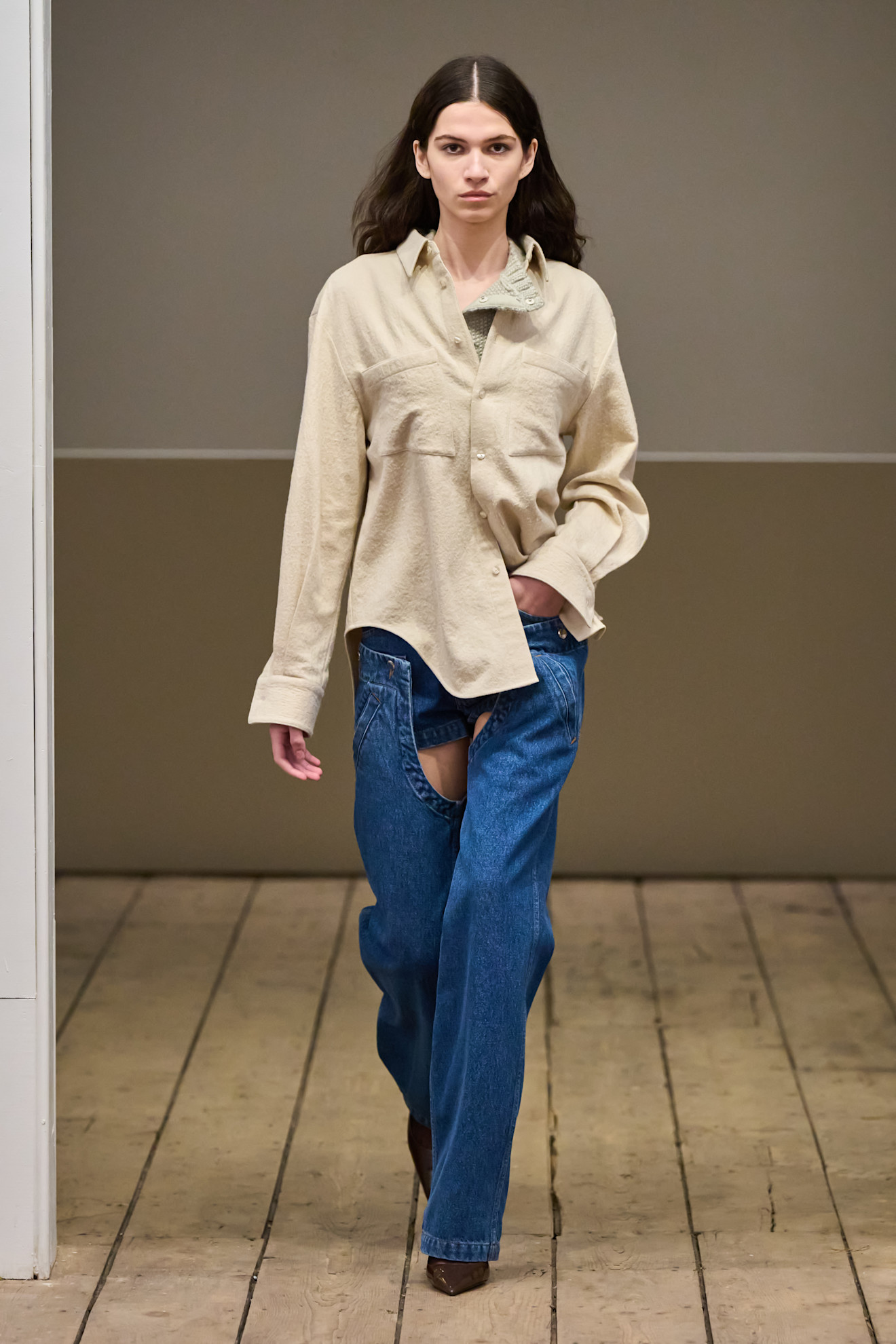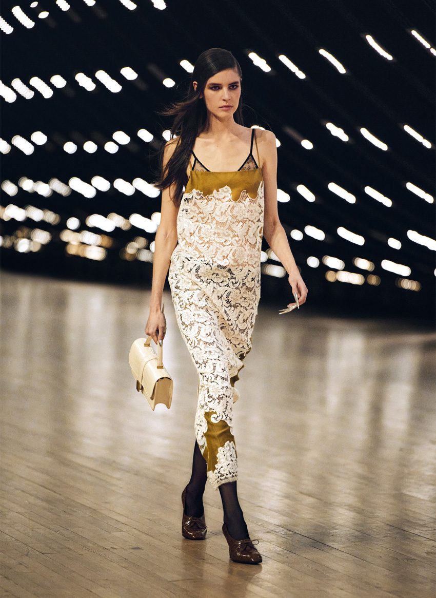 Se Eckhaus Latta é para aqueles que se recusam a crescer, Khaite é para os que entendem a elegância como o objetivo mais importante da Moda. Estação sim, estação sim, Catherine Holstein fundamenta o guarda-roupa feminino. Com designs que frequentemente inspiram réplicas, a marca americana é a melhor (ou talvez única) referência para entender o que a mulher moderna quer. Neste caso: ombros fortes, cinturas apertadas, botas slouchy. O desfile começou com silhuetas militares executadas em camisas translúcidas com botões oversized e acabou com vestidos que combinavam renda floral com seda volumosa—Holstein tem um talento de destilar as tendências de amanhã em peças intemporais.