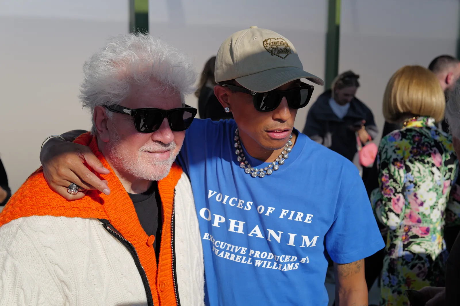 Cumprimentei Pharrell Williams, muito simpático e sentado ao lado da eterna Anna Wintour, que também cumprimentei. Com Pharrell, relembrámos um jantar com Penélope [Cruz] em 2006, quando ele estava a desenhar uns moletons extra grandes com padrões de diamantes e teve a gentileza de me enviar dois para o hotel — tudo isso enquanto procurava o meu lugar. Encontrei-o ao lado de Charlize Theron. Impecável, elegante e perfeita, toda de preto, com uma espécie de capa de gaze e saia de couro. Assim que se sentou, olhou à sua volta e, como por magia, apareceu a sua assistente com um lindo leque preto. Naquele momento, pensei que aquela assistente acabara de ganhar o prémio de melhor assistente do evento por materializar aquele leque que todos os outros invejávamos.