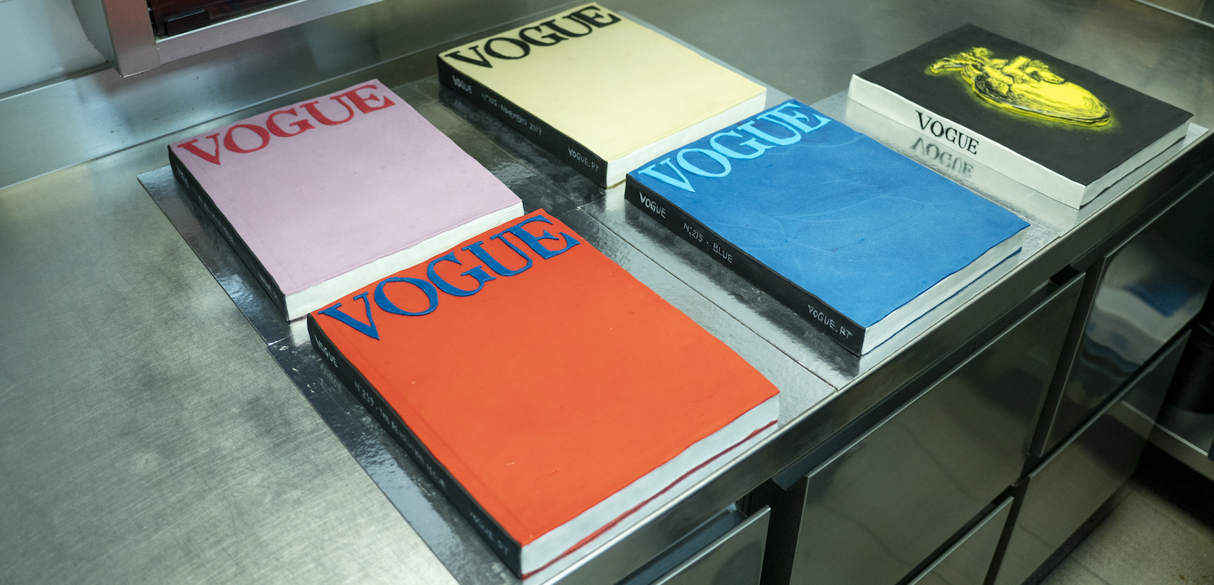 It was a birthday party with more glamour than your average one, but a birthday party nonetheless. And any self-respecting birthday party has cake, in this case, with the same glamour. One wouldn't expect anything else, from five Vogue covers styled by the Hotel Hotel's pastry chef, Kozue Morimoto, who took our passion for print literally and turned the pleasure of reading into the pleasure of tasting.