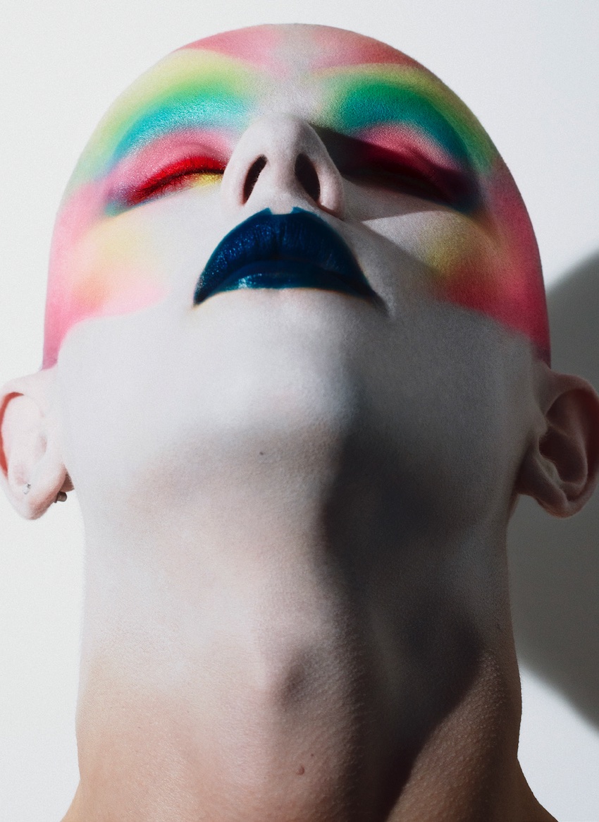 Oly Hart, drag queen artist, lends his face and positive attitude to a beauty editorial that explores the spectrum of the most vibrant Pantones.