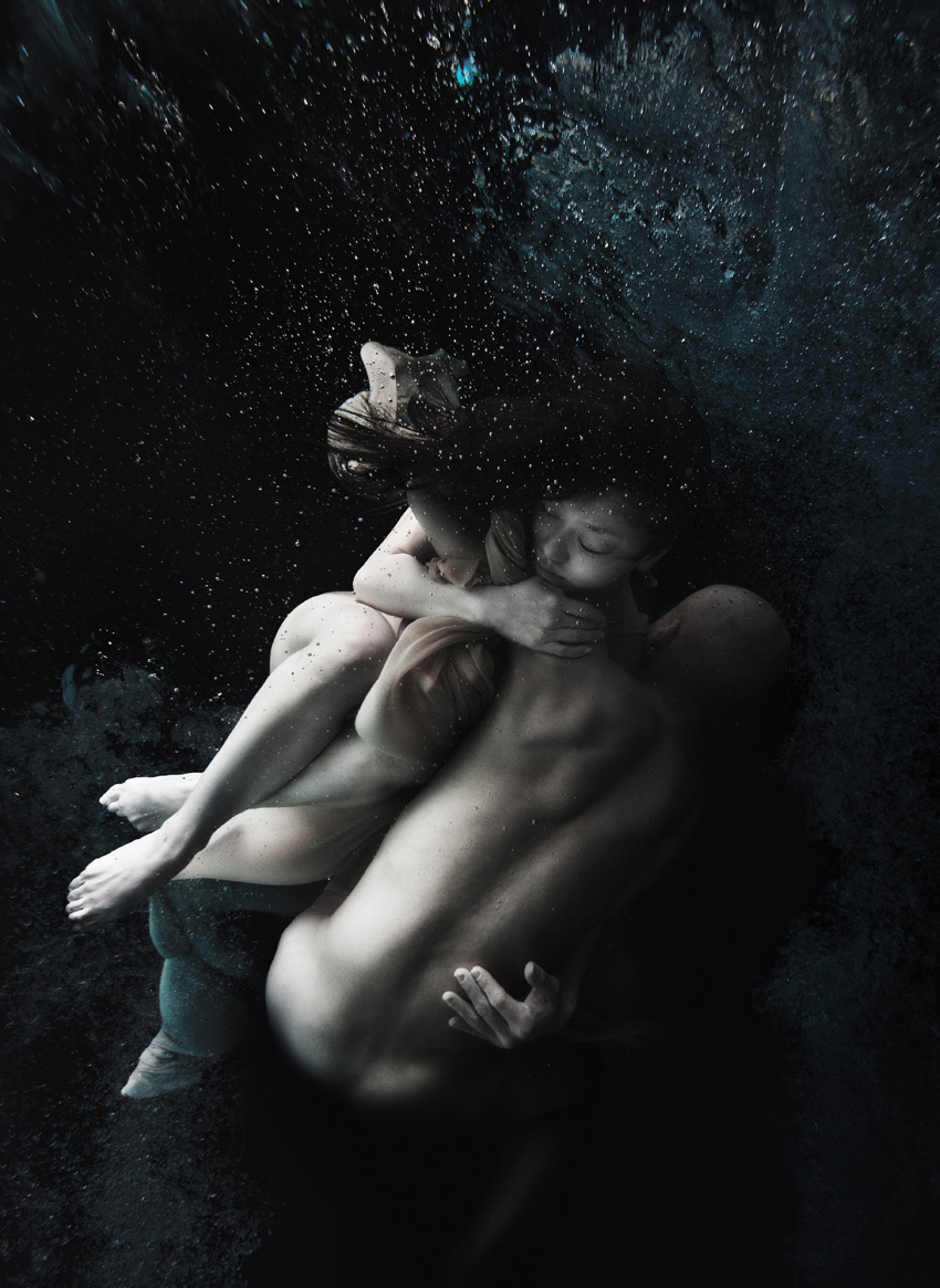 In my work, light is an essential part of the creative process. Light is refracted and dispersed in a particular way in underwater spaces, creating fantastic and impressive visual effects. The photo shoot depends entirely on artificial lighting and, under my direction, my assistants manipulate the light sources with great precision while observing the movements of the models. The angles, intensity and timing of the lighting are meticulously composed, taking into account the brilliance of the water and its interaction with the subject. The resulting interweaving of light and shadow gives the work a unique mystical and surreal atmosphere. In post- production, the contrast between light and shadow is emphasised to further enhance the astonishing underwater atmosphere.