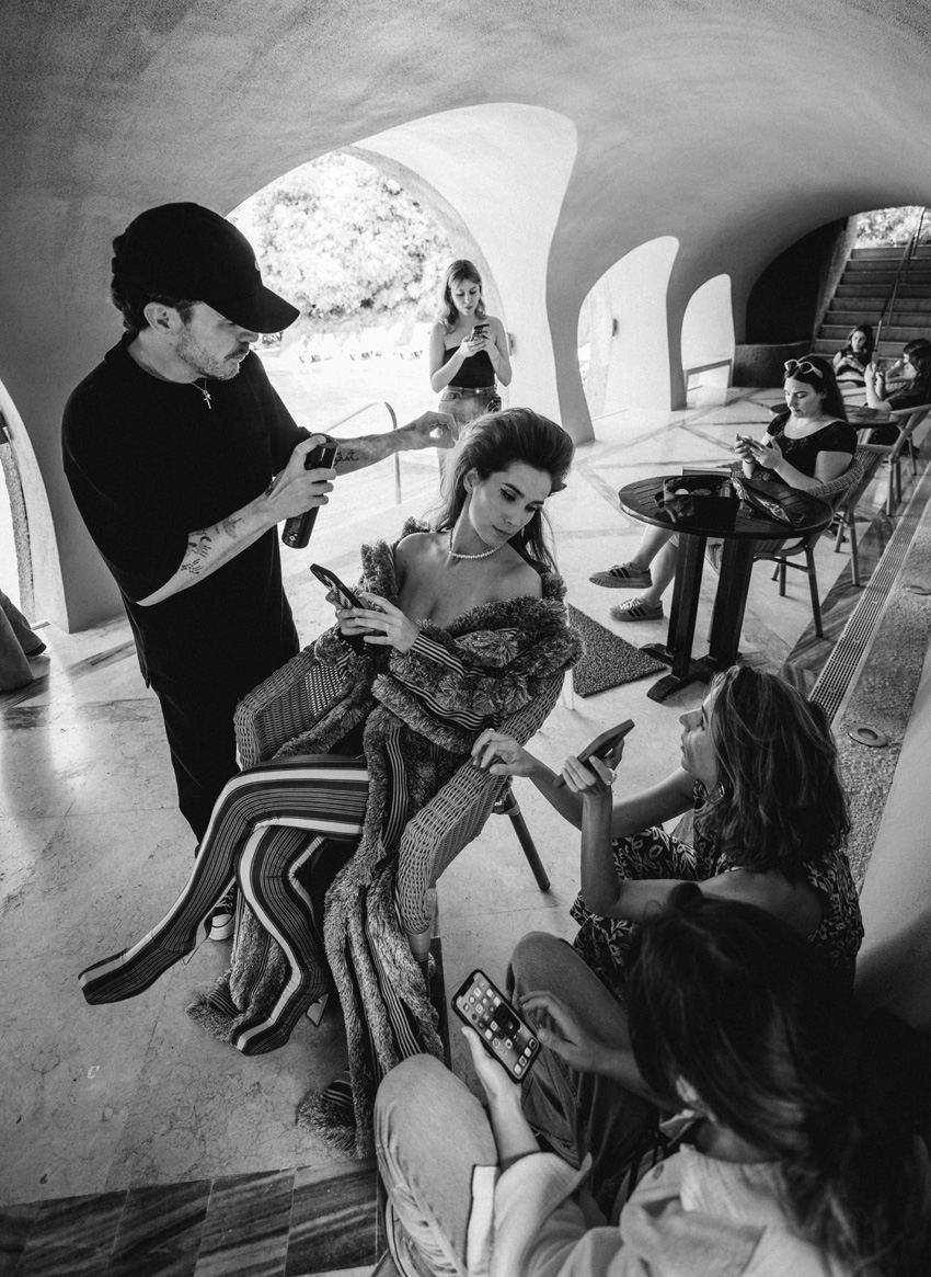 The Spanish influencer channels the essence of the 1960s in an editorial to see on page 384, an image that fits her effortlessly. In some behind-the-scenes of the production, captured by Gonçalo Castelo Soares, the groovy look fits her like a glove on a backstages that pinpoints the good vibes of the place. The final photographs captured by Branislav Simoncik are to see further ahead in this issue; the backstage frames are printed on this page, but also in digital, in Vogue.pt, in the QR Code in print.