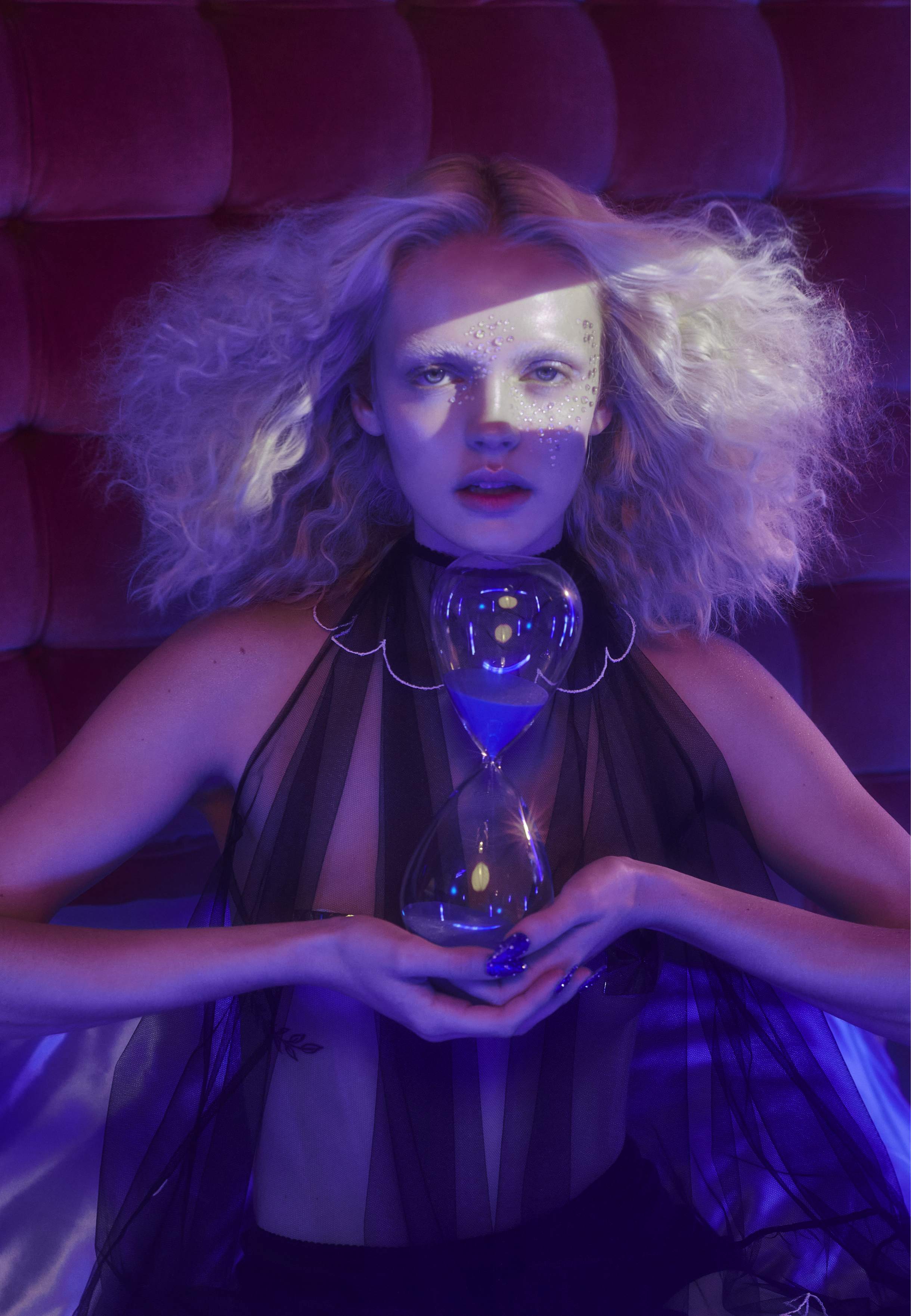 Soutien, Bluebella. Luvas, Lillian Shalom. Base líquida Radiance Face and Body Sheer Foundation, no tom N1, € 35,95, MAC, em Lookfantastic.pt. Pigmento em creme para sobrancelha Brow Engineer, no tom Platinum, € 14,95, Sensorium. Sombra de olhos em stick Shadowstick, no tom Creature, About – Face. Blush em pó Dior Backstage Rosy Glow, no tom Pink, € 38,50, e paleta de iluminadores e blush Dior Backstage Glow, no tom Rose Gold, € 50,90, ambos Dior, em Sephora.pt. Batom líquido Colour Powder Kiss, no tom Elegance is Learned, € 22,45, MAC, em Lookfantastic.pt. Estrelas (na face), da produção.