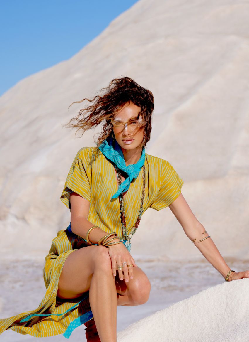 Com um respeito inabalável pelos processos que definem a indústria da Moda e pelas mãos que criam os têxteis que dão vida ao guarda-roupa, a coleção foi criada inteiramente com a técnica ancestral do block print – uma arte que exige a combinação ideal de tempo, precisão e experiência. Num leque de peças que brilham entre padrões vibrantes e tecidos naturais, a coleção reflete a energia contagiante da cor e do movimento, através de silhuetas numa paleta intensa e luminosa que transcendem estações e fronteiras.