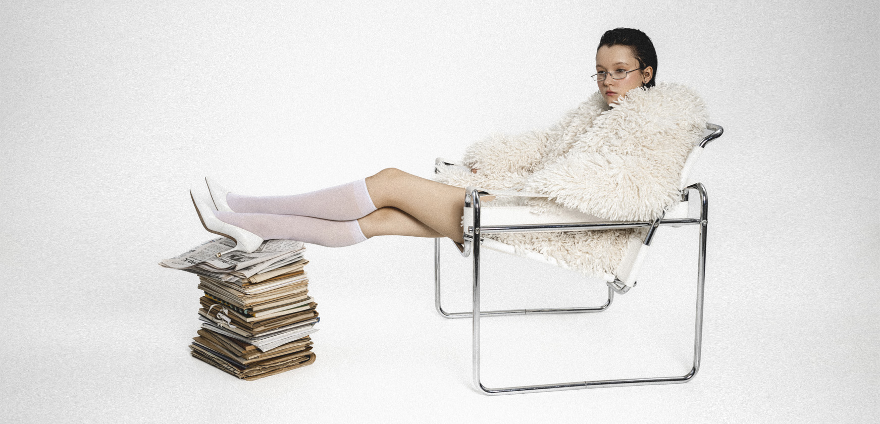 Casaco, H&M STUDIO. Soutien e cuecas, vintage, CHRISTIAN DIOR, na Peters Collective. Óculos vintage, YVES SAINT LAURENT, na Record Couturier. Colares, tudo da produção.