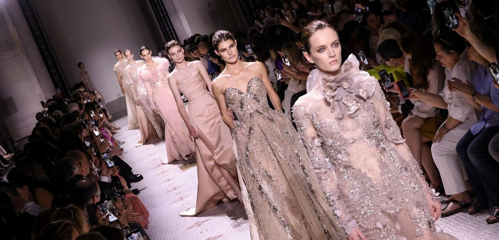 Manequins na passerelle no desfile Elie Saab Alta-Costura outono/inverno 2024-2025 durante a Semana da Moda de Paris no dia 26 de junho de 2024, em Paris, França. Fotografia: Lyvans Boolaky/Getty Images