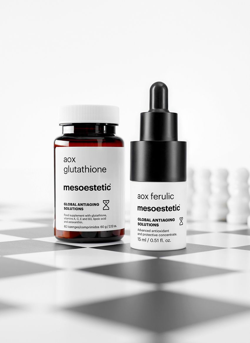 Para combater as várias frentes do envelhecimento e limitar os efeitos derivados de fatores como a exposição solar, a poluição e o stress, o aox ferulic e o aox glutathione proporcionam à pele luminosidade, firmeza e um efeito flash imediato, de forma a mantê-la protegida e jovem durante mais tempo.