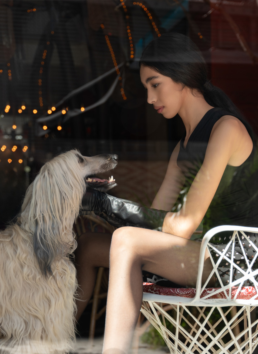 Blazer, calças e sandálias, TOM FORD; vestido, ALAÏA. Luvas, VIVIEENE WESTWOOD.