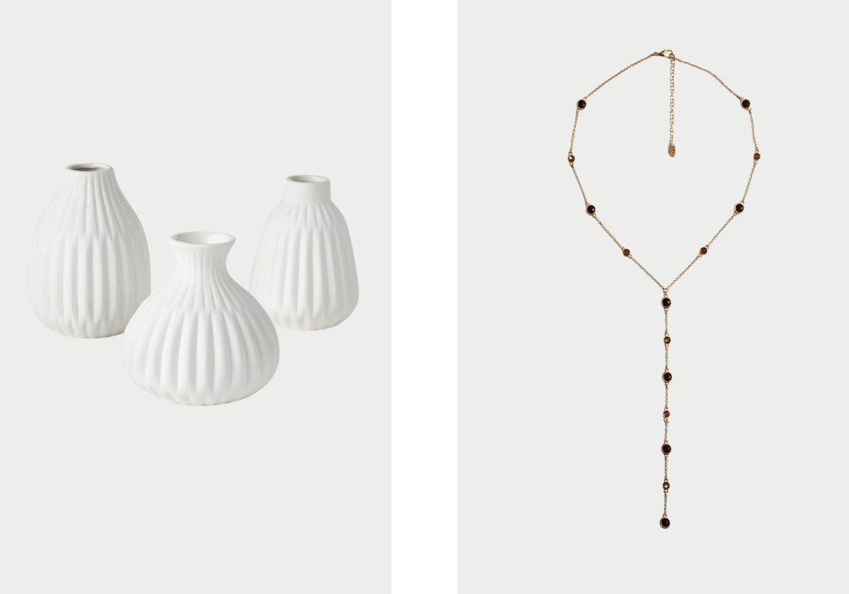 Jarras de porcelana pequenas Palo, 16,99€, Westwing; Colar comprido combinado, 15,99€, Mango