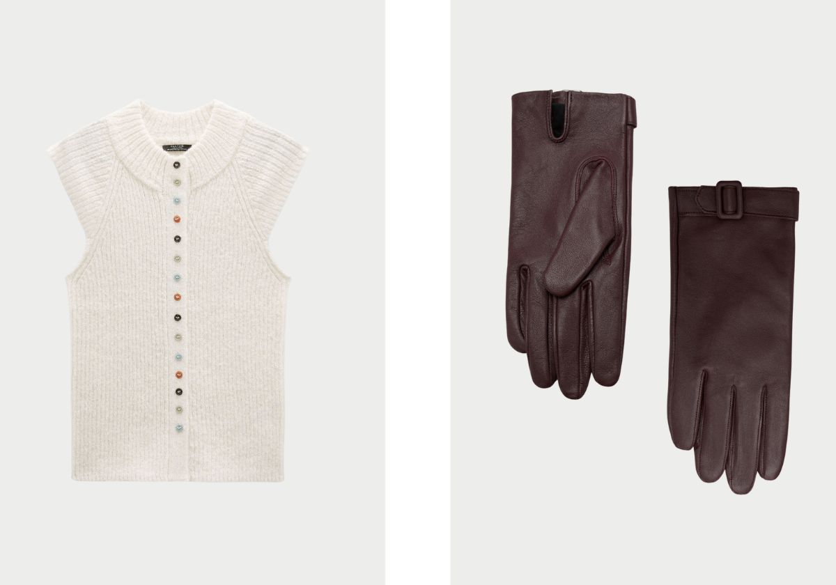 Colete de malha mistura de lã, 29,99 €, Vicky Montanari x Parfois; Luvas de pele, 29,99 €, Mango.