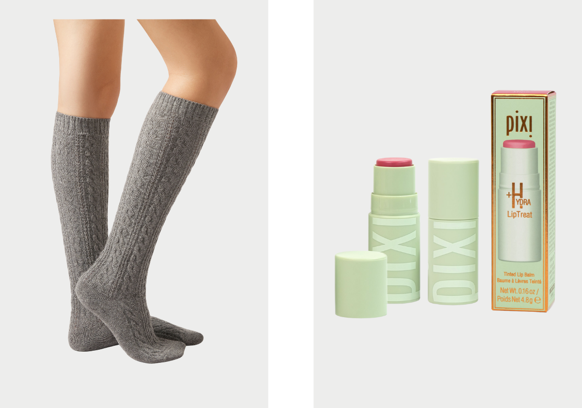 Meias Altas com Caxemira Entrançada, 9€, Calzedonia; Bálsamo para os lábios com cor, 9,99€, Pixi na Sephora.