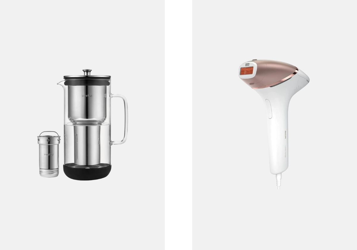 Jarro de água com filtro Purifier, €129, aarke, na Westwing; Dispositivo para remoção pelos através de IPL com SenseIQ Lumea IPL Série 8000 Prestige, €479,99, Phillips.