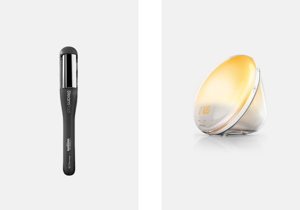 Placa de alisamento a vapor SteamPod 4 Meteora, €490,25, L'Oréal Professionnel, na Wells; Candeeiro SmartSleep Wake-up Light, €162,63, Phillips, em amazon.es.