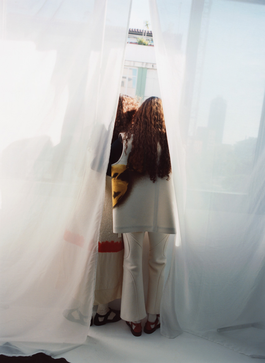 Da esquerda para a direita, Gunnhild e Martine: casacos e calças, tudo BAUM UND PFERDGARTEN. Meias, da produção. Ganchos, PATOU. Sapatos, HEREU.