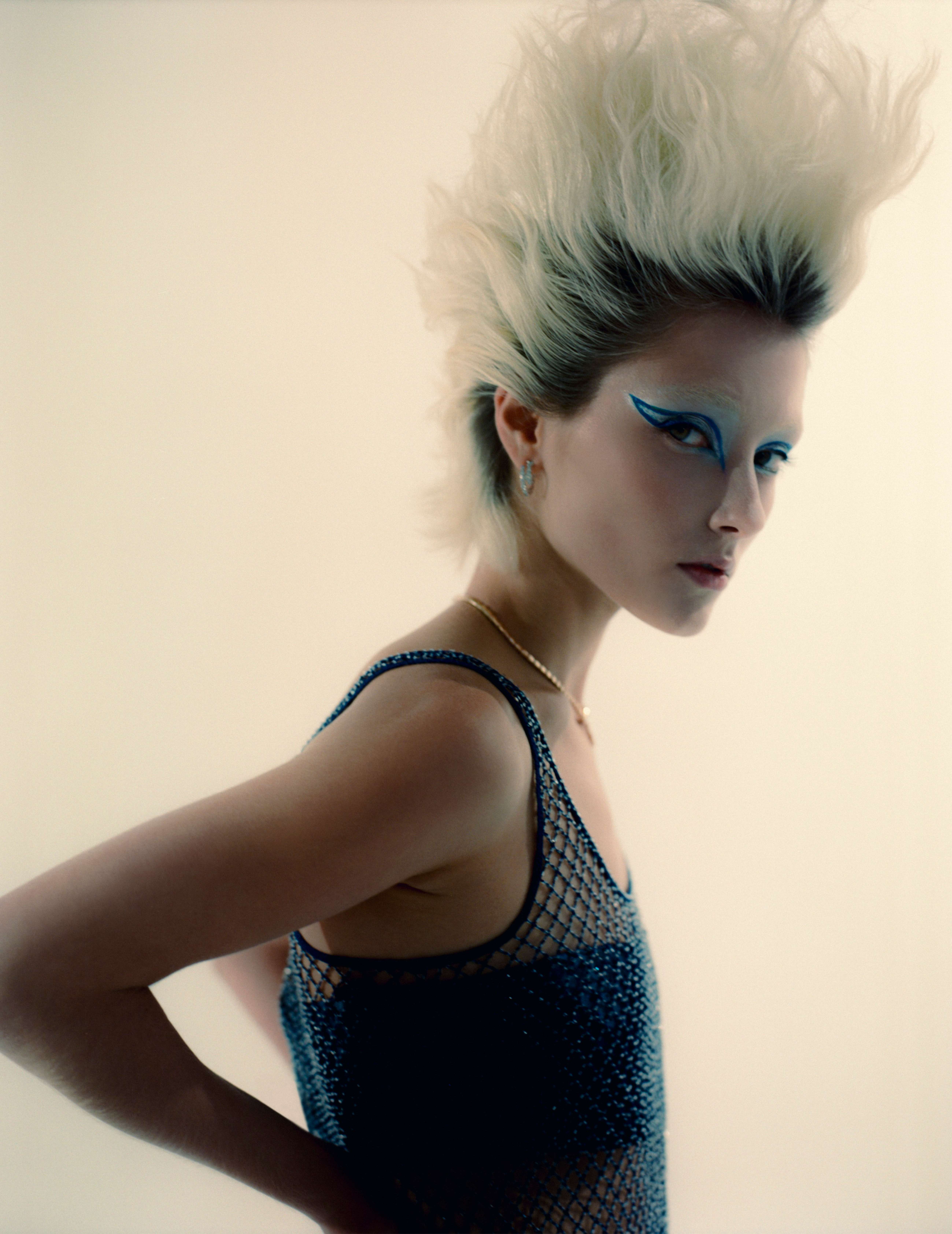Franny: top, ELOISE BRISTOWE. Vestido, JORDAN DALAH. Base Vital Skin, no tom Atelier N, € 58, WESTMAN ATELIER. Pigmento em creme (usado no olho) Paint Pot, no tom Black Mirror, € 28,50, e pigmento em pó (usado no olho) Pigment, no tom Silver Fog, € 28,50, MAC.