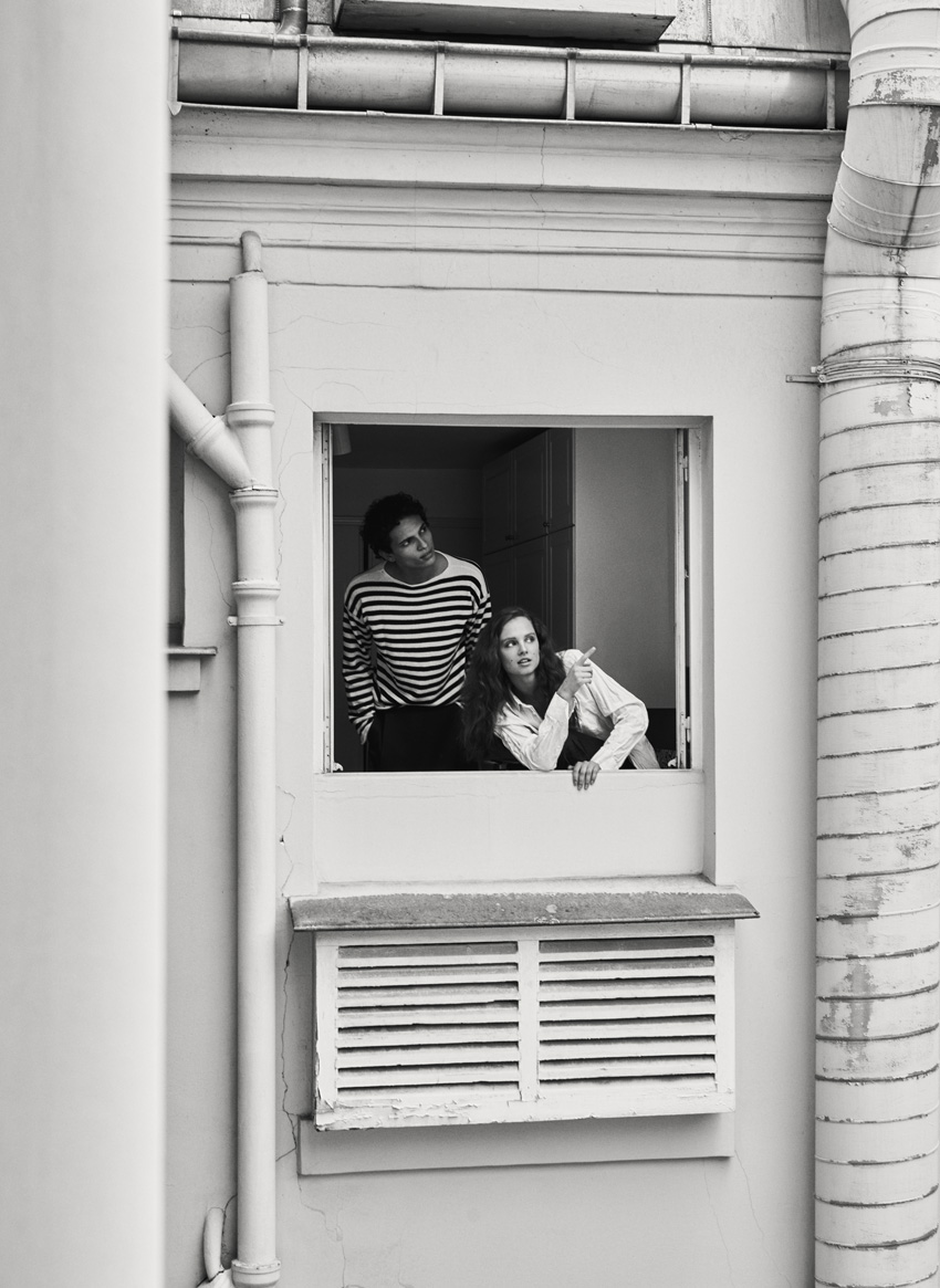 Bradley: capa e calças, COPERNI. Sapatos, CHURCH’S. Giselle: camisa, collants e sapatos, tudo COPERNI.