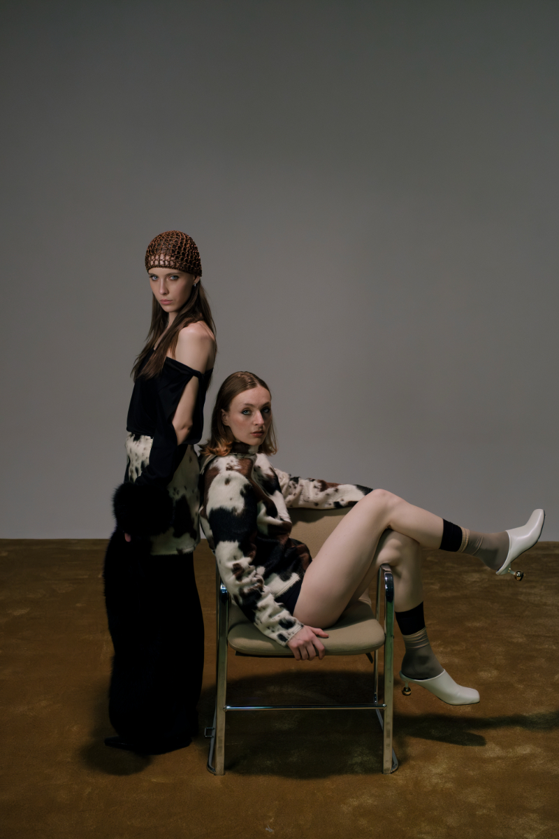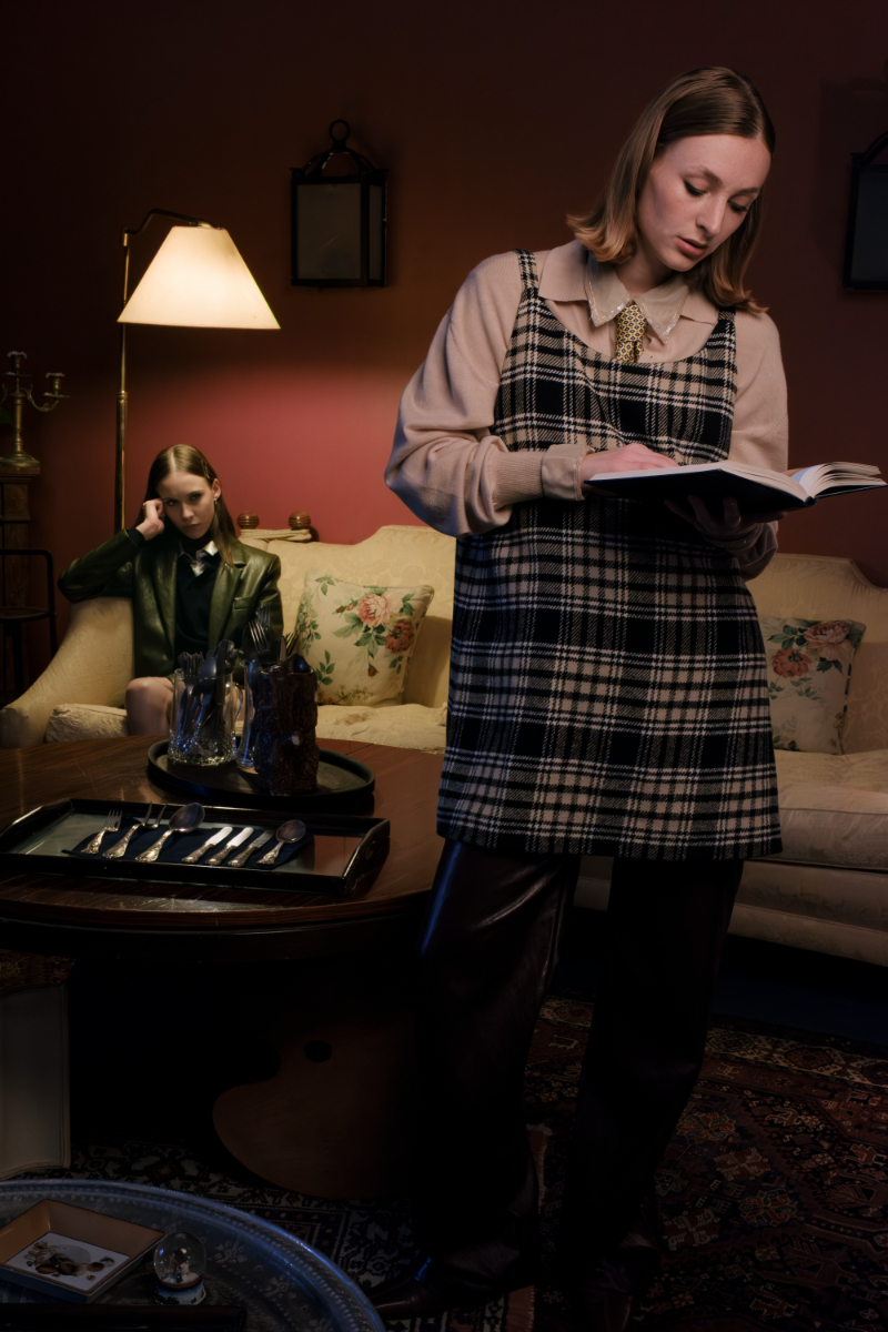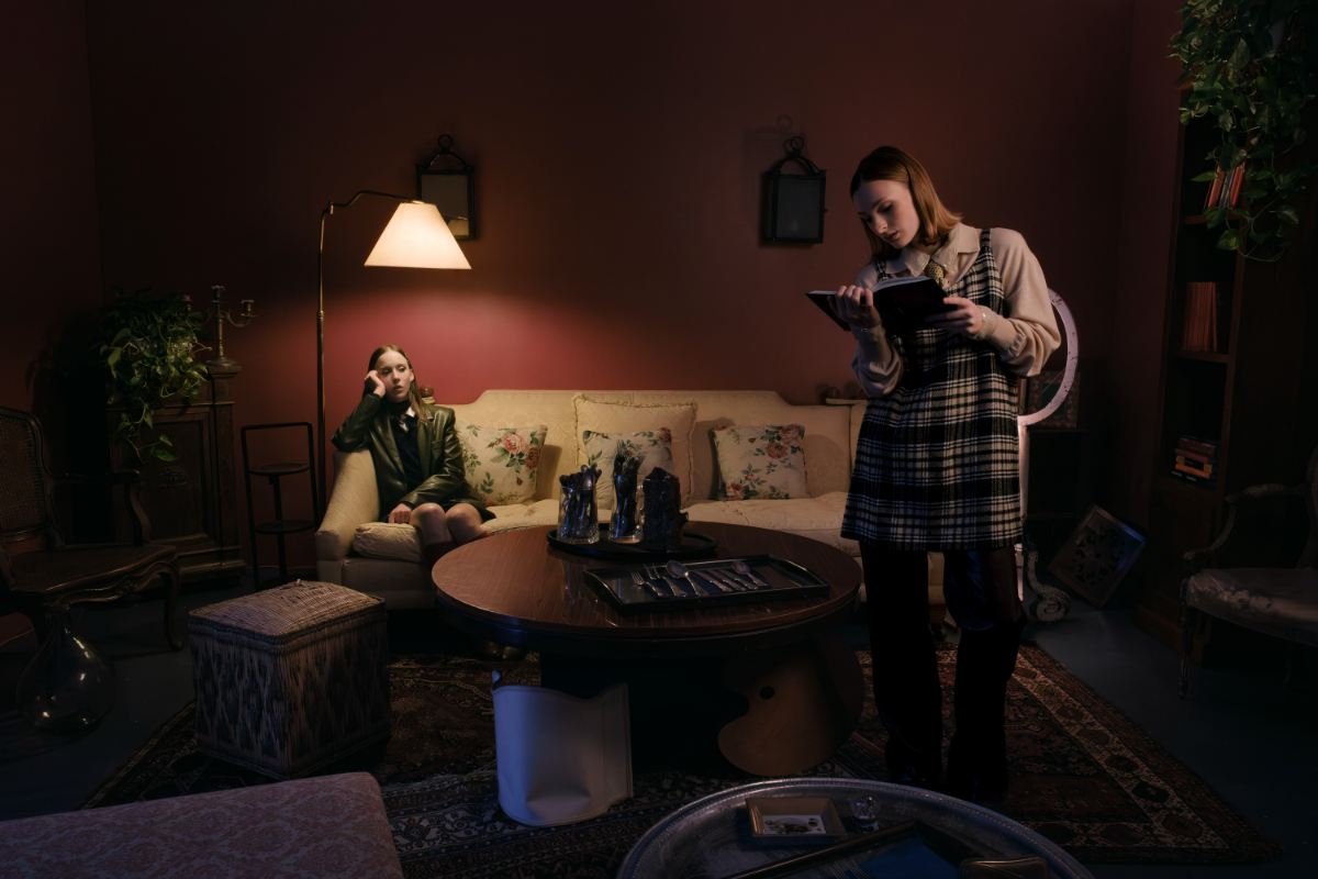 Lucia: casaco, FACE TO FACE. Body, GIULIA GAGLIARDI. Brincos e pulseiras, ÈRI SIX. Cinto, meias e sapatos,tudo da produção; Laura: blazer, colete, camisa e calças, tudo FACE TO FACE. Óculos, vintage da produção.