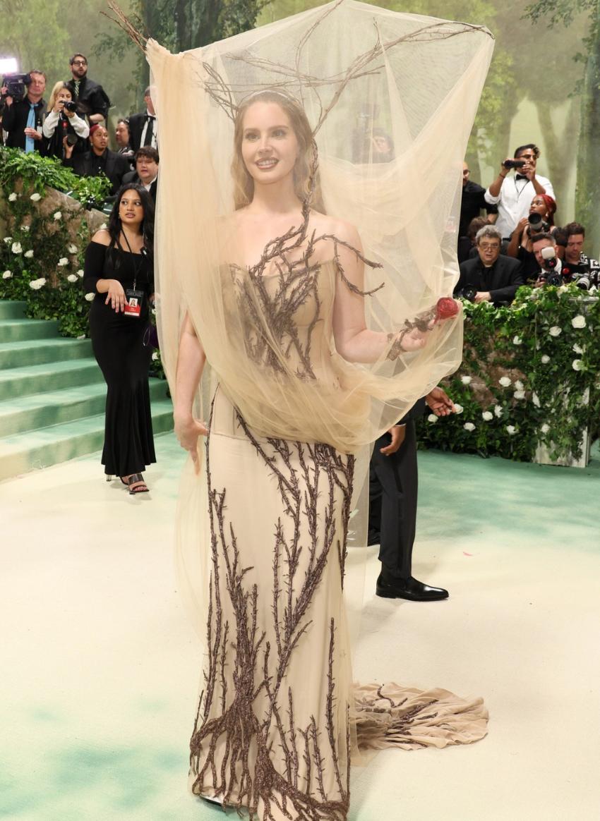 Esta noite marca a terceira participação de Del Rey na Met Gala. Em 2018, para o tema Heavenly Bodies, a cantora entregou um dos melhores momentos de Moda da noite num look Gucci custom made, chegando à red carpet ao lado de Jaret Leto. O design ostentava um vestido creme com detalhes dourados, incluindo uma aplicação no peito de um sagrado coração (perfurado com pequenos punhais) e um acessório de cabeça azul ombré com asas. Em 2012, Del Rey chegou à gala com um look elegante de Altuzarra; o seu vestido prateado metálico, com um decote em forma de coração, vinha com uma capa preta dramática. Esta noite, com o seu look focado na natureza, a cantora voltou a impressionar-nos.