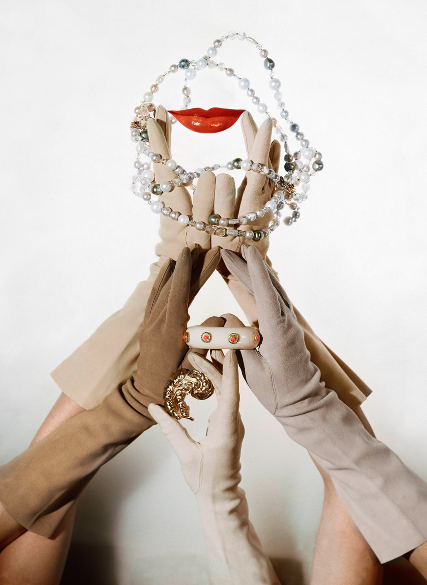 Fotografia de John Rawlings. As joias como rosto de quem as usa - literalmente? -, nesta fotografia para a Vogue US, de 1960, com bangle e colar de contas por De Mario, e alfinete da Monet.