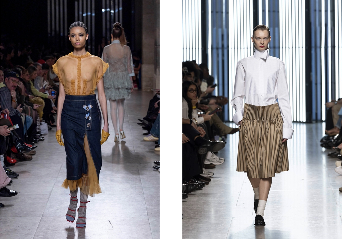 Carlos Gil celebra a diversidade da mulher moderna. Com uma pluralidade imensa de silhuetas, têxteis e padrões, o designer concretiza um guarda-roupa que desafia a definição. Transparências sobrepostas a ganga, padrões geométricos combinados com penas, lantejoulas e adornos florais: Gil procura capturar o caos de referências que compõem um estilo pessoal. Por sua vez, Luís Carvalho propõe um exercício antitético. As propostas para outono/inverno 2026 apresentam uma visão coesa com uma silhueta e paleta de cores rígida. Intitulada AFTERIMAGE, a coleção faz da alfaiataria uma linguagem. Casacos que desconstroem noções de blazers andam lado a lado com casacos que definem cinturas extremas. Camisas brancas rígidas, aparentemente imóveis mesmo perante o movimento do corpo, são complementadas por saias plissadas que dançam à medida que as modelos andam. É neste contraste que a coleção encontra o seu maior sucesso.