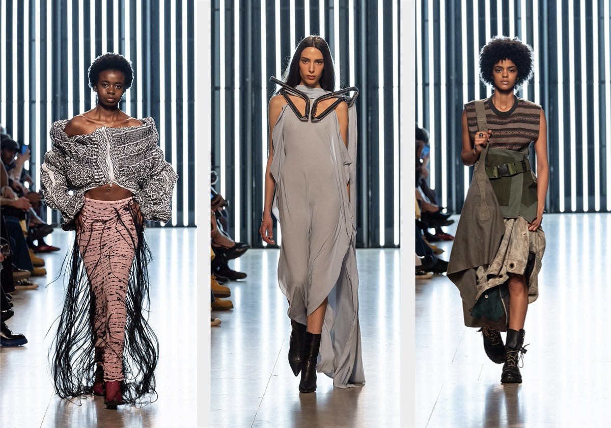 Começamos pelo mais entusiasmante: o futuro. A iniciativa Sangue Novo, um projeto que procura encontrar e apoiar designers emergentes, apresentou as coleções dos cinco finalistas decididos na edição da ModaLisboa de outubro. Adja Baio, Ariana Orrico, Mafalda Simões, Mariana Garcia e Usual Suspect criaram as propostas não só representativas das suas visões, como indicativas do futuro da Moda em território nacional. As duas vencedoras do concurso, Ariana Orrico e Mafalda Simões, são presságios entusiasmantes para a indústria portuguesa. Orrico apresentou uma coleção de menswear que explora a vulnerabilidade através da performance de masculinidade. Com materiais clássicos como cabedal, a designer cria silhuetas que desafiam expetativas tradicionais. Casacos rígidos são usados com nada a não ser roupa interior, a nudez em si utilizada como linguagem. Simões, por sua vez, cria metáforas entre o corpo humano e os materiais que usamos para o proteger. Através de malhas e crochets, a nossa vulnerabilidade é explorada. Tal como as fibras em camisolas volumosas ou vestidos dramáticos, a natureza humana é maleável, orgânica.