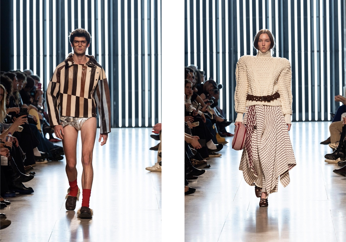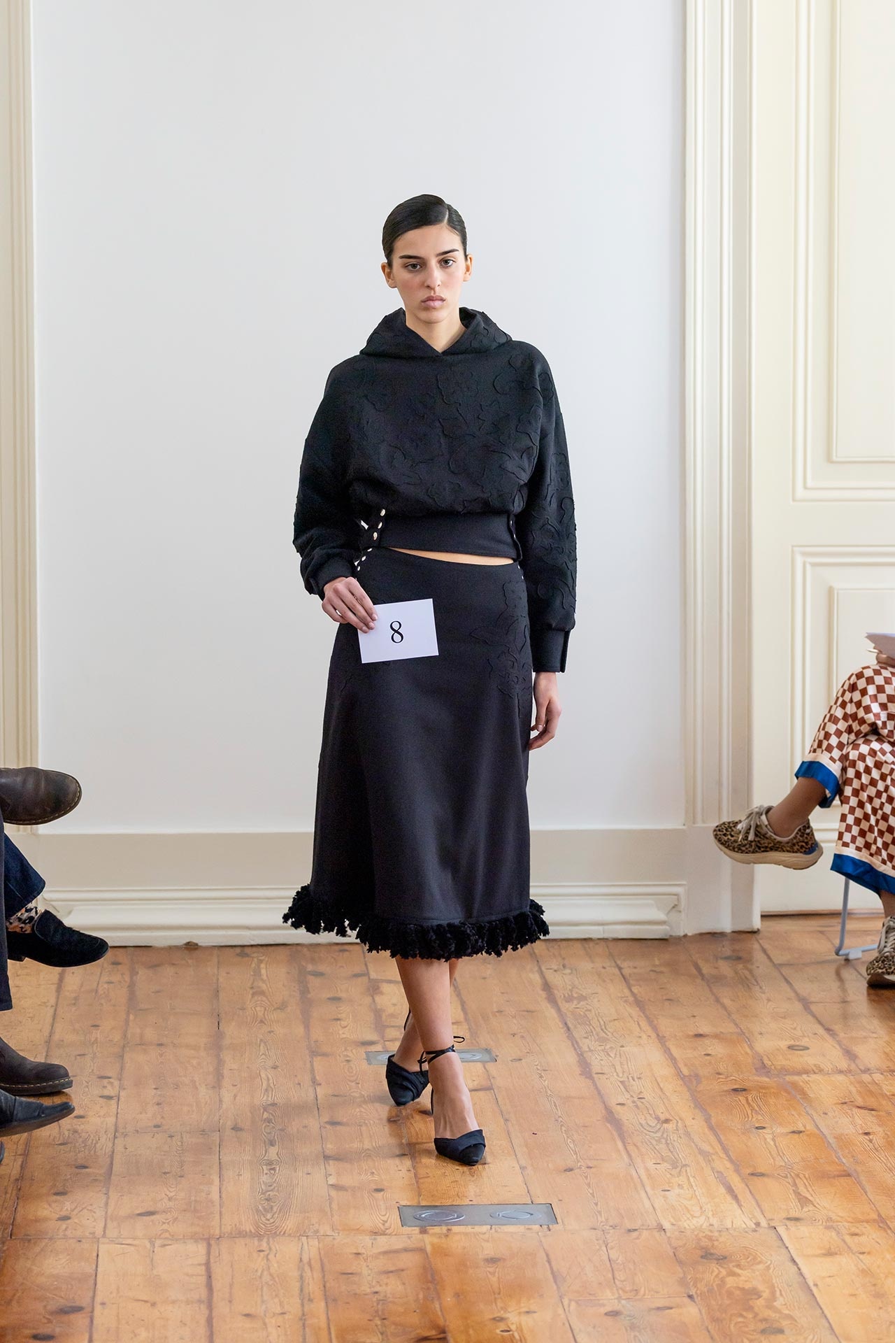 Para as suas propostas outono/inverno 2026, Béhen apresentou uma coleção que, como é típico da designer, explora o património têxtil português. Com apenas nove looks, Joana Duarte prova a destreza artesanal do seu estúdio. Saias em lã com técnicas de Nisa, vestidos com folhos reminiscentes das saias da Nazaré, hoodies em Burel, um vestido bordado com um padrão inspirado nas algibeiras do Minho. A designer aproveita todas as oportunidades que tem para explorar e modernizar técnicas artesanais nacionais. Este esforço é particularmente honroso tendo em conta a posição em que Duarte se encontra. Como a designer portuguesa com maior reconhecimento internacional de momento — nem há um mês, Béhen venceu o prémio MMM Textile, Savoir-Faire et Artisanat —, o seu compromisso em preservar o património português faz da sua marca um reflexo de uma cultura tão frequentemente subestimada.