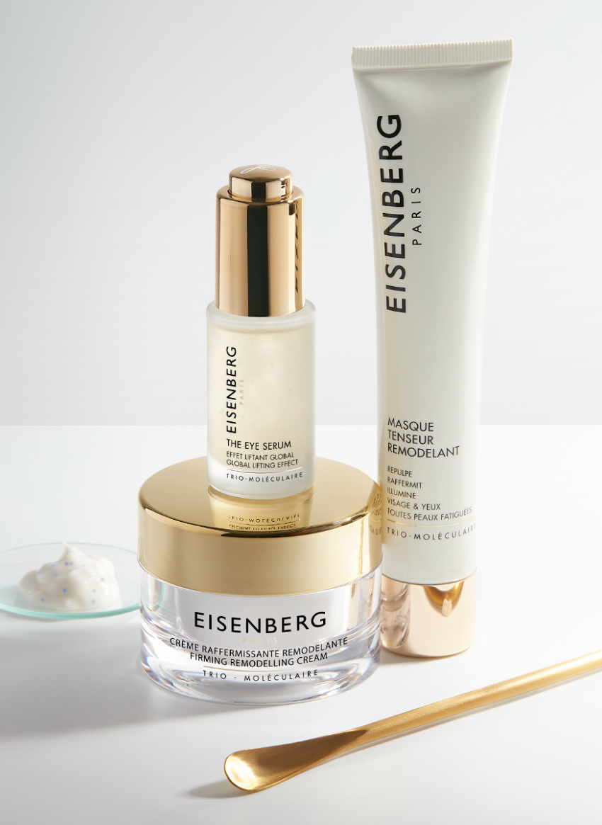 Constituído pelo creme de rosto Crème Raffermissante Remodelante e o sérum de contorno de olhos The Eye Serum, este duo serve o propósito de combater a perda de firmeza, elasticidade e luminosidade que ocorre no rosto com o passar do tempo. No coração da sua fórmula está a tecnologia Trio-Molecular, patenteada e exclusiva à Eisenberg, que tem o poder de regenerar, energizar e oxigenizar a pele, e três novos ingredientes – péptidos de arroz, óleo de grainha de uva e extrato de chá verde – que atuam sobre os primeiro sinais de envelhecimento cutâneo.