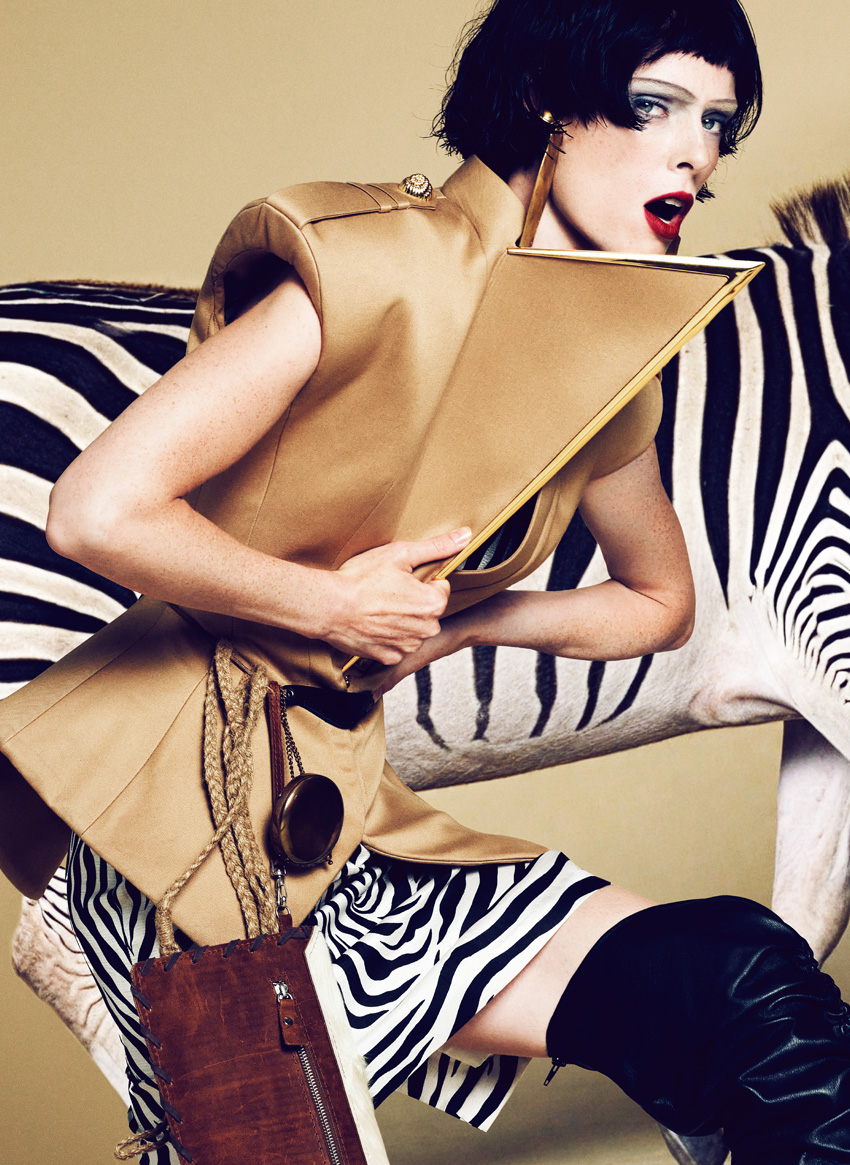Num jogo de animal prints e sombras esquivas, Coco Rocha é predadora e presa nesta caça aos estampados mais selvagens da estação. Na senda de um objeto que está constantemente a escapulir-se, as fronteiras entre humano e animal esbatem-se à medida que a nossa protagonista se transforma no próprio felino que tenta alcançar. A metáfora perfeita de uma metamorfose que a selva urbana parece estar constantemente a exigir, a analogia apropriada para vestir os melhores padrões da savana no quotidiano de um bosque de cimento que mimetiza as hierarquias do mundo selvagem. Welcome to the jungle — com guarda-roupa à altura.