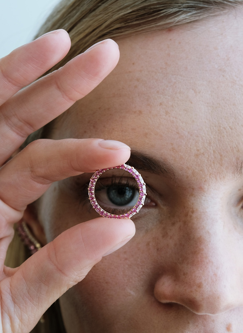 Azul, verde, cor de laranja, amarelo: as possibilidades de combinações são limitadas apenas pela nossa imaginação. Se, no geral, a Rosekey assume inspiração no mesmo arco-íris que Dorothy seguia, também se distancia deste quando necessário. Um dos destaques da coleção é a utilização da safira rosa, uma pedra que é novidade no espólio da marca — e que, com uma simbologia associada ao amor, se encaixa perfeitamente no seu éthos.