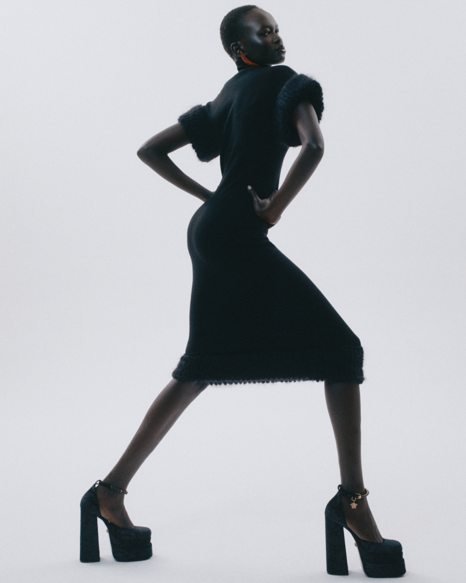 Vestido, MOSCHINO. Sapatos, VERSACE.
