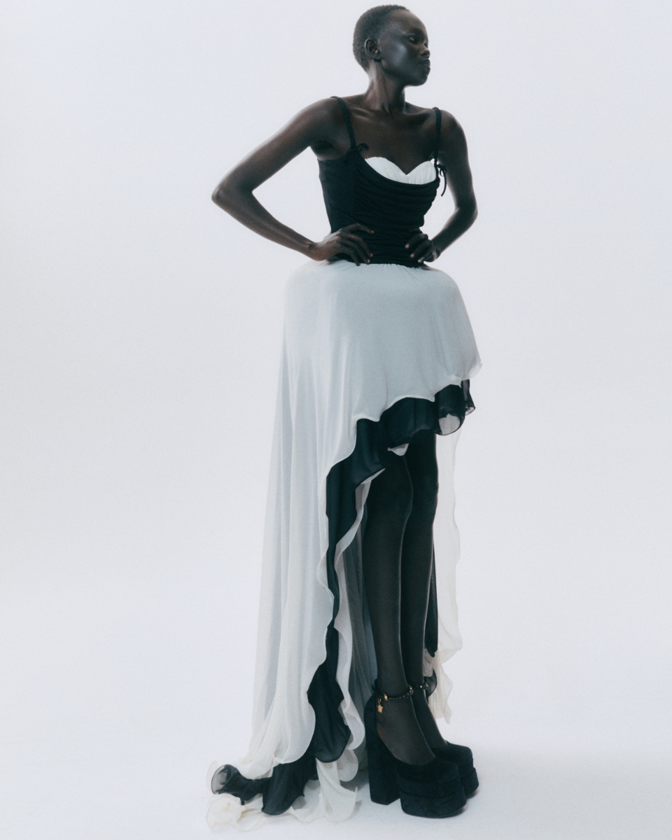 Corset, MOSCHINO. Vestido vintage, da produção. Sapatos, VERSACE.