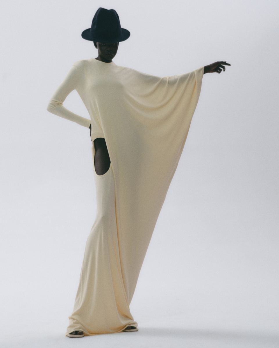 Vestido, TOM FORD. Chapéu, VIVIENNE WESTWOOD. Sapatos, JACQUEMUS.