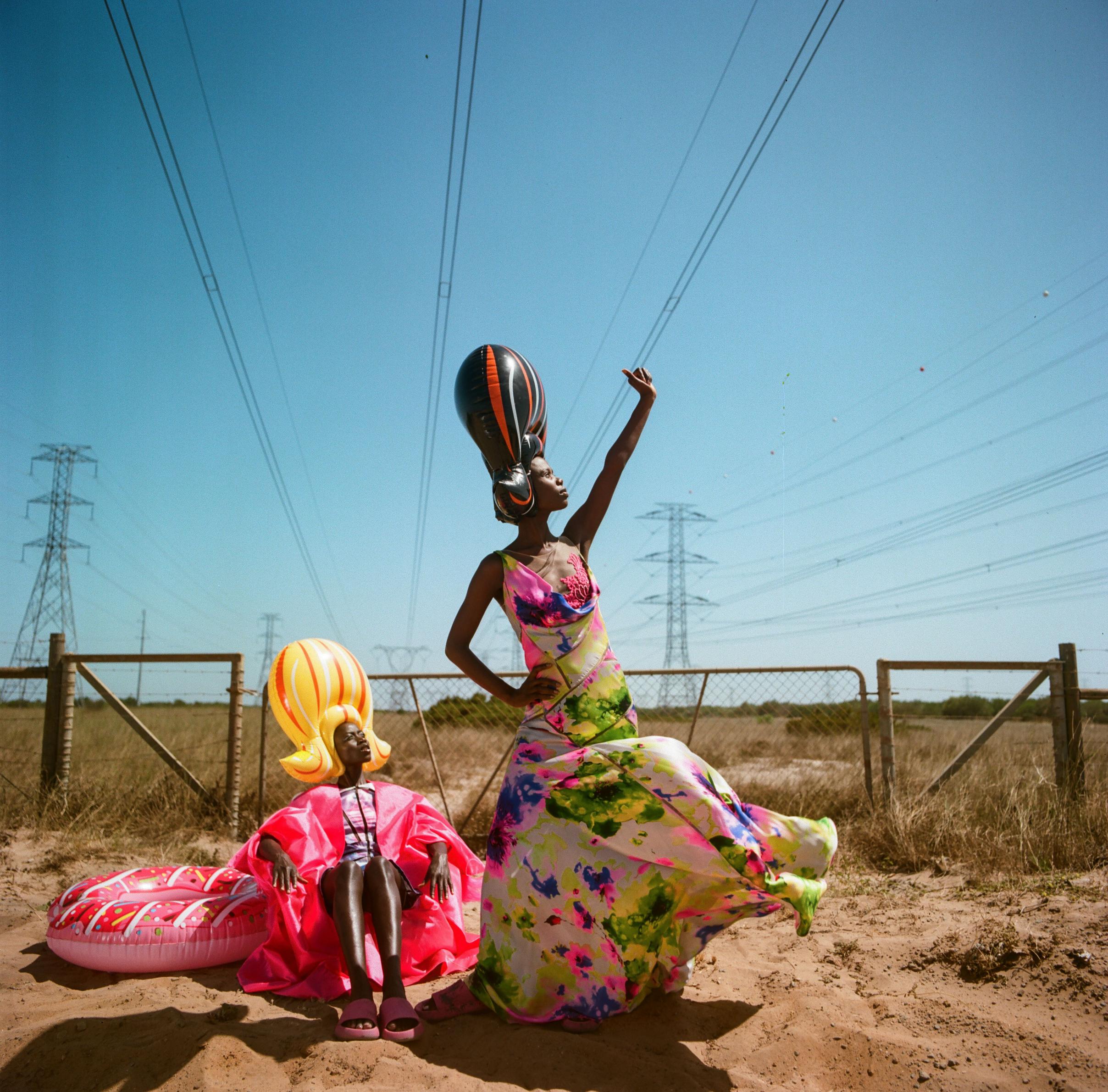 Zana e Olivia: chapéus, tudo CRYSTAL BIRCH. Lebuhang e Zana: vestido e bodysuit, RICH MNISI. Óculos de sol e mules, RUBI. Chinelos, da produção.