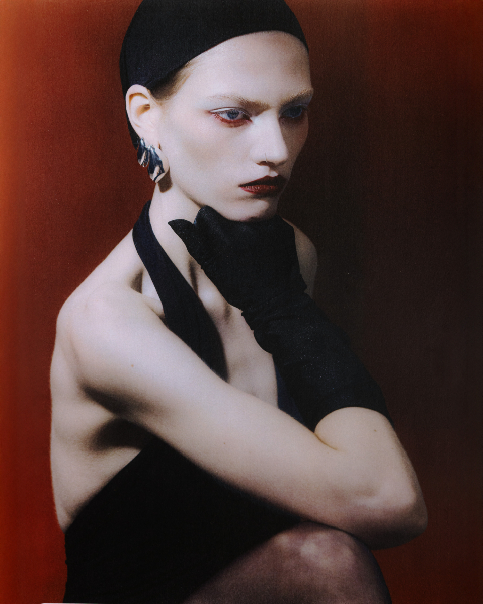 Top, LA MANIA. Brincos, JASMIN SPARROW. Luvas vintage, da produção.
