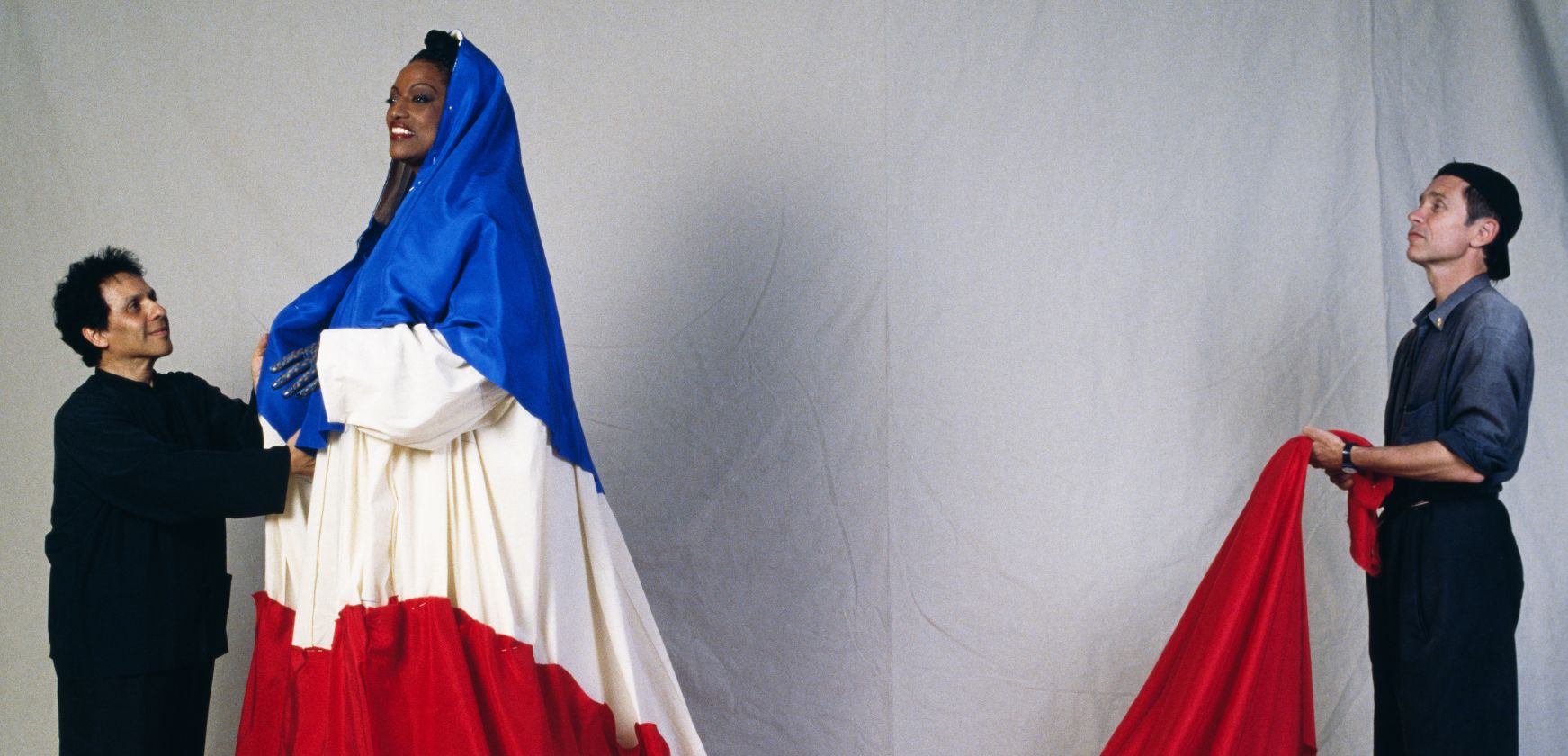 O coreógrafo Jean-Paul Goude, à direita, responsável pela organização do desfile de celebração do 200º aniversário da Revolução Francesa, e o designer de moda Azzedine Alaia à esquerda, preparam o look de Jessye Norman para o desfile.