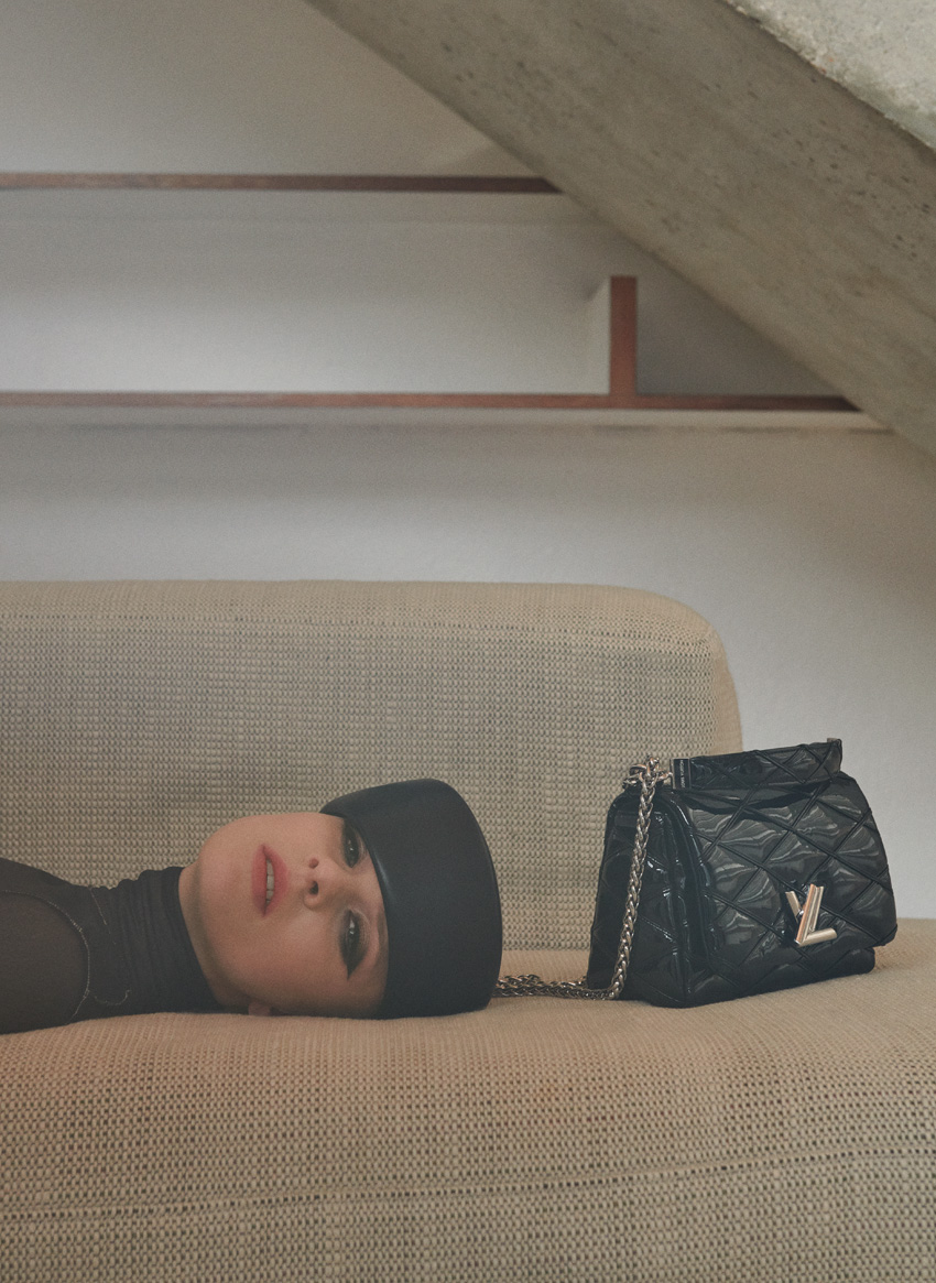 Fleur: top e chapéu, ALAÏA. Carteira, LOUIS VUITTON.